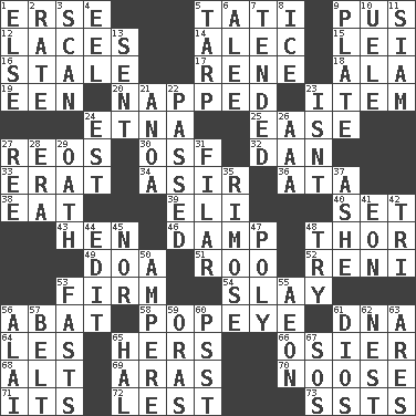ACROSS 1. Celtic language 5. Jacques of French films 9. Festering 12. Shoestrings 14. Actor Baldwin 15. Luau accessory 16. Having lost freshness 17. French philosopher Descartes 18. According to 19. Car or cant ending 20. Slept 23. Detail 24. Inactive volcano in Sicily 25. Comfort 27. Vintage cars 30. Order of Saint Francis (abbr.) 32. Daniel's nick name 33. Part of Q.E.F. 34. SW Saudi Arabia district 36. "One Day ___ Time" 38. Consume 39. Biblical high priest 40. Put into a specified state 43. Layer 46. Moist 48. Son of Odin 49. ___ good deed 51. Friend of Pooh 52. Painter Guido (1575-1642) 53. Become taut 54. Kill 56. Blind as ____ 58. Wimpy's pal 61. Heredity factor (abbr.) 64. French article 65. Possessive pronoun 66. Flexible twig of a willow tree 68. Keyboard modifier key 69. Ancient river in northeast Turkey 70. Trap for birds or small mammals 71. It is 72. For fear that 73. Fast planes DOWN 1. Otherwise 2. Pace 3. Glance over 4. Snakelike fish 5. Canvas cover 6. Toward shelter 7. Looked after 8. Frozen water 9. Food holder 10. Ubangi River tributary 11. Thailand, formerly 13. Emitted 21. Small Philippine buffalo 22. Went by 23. Is not 24. Eastern Standard Time (abbr.) 26. American Automobile Association (abbr.) 27. To separate or throw off 28. Epoch 29. Pledge 31. Having threads 35. Full of chinks, cracks, or crevices 37. American tennis player Robert 41. A really long time 42. Three (prefix) 44. Prepare for publication 45. Or not 47. Many (prefix) 48. Attempt to accomplish something 50. Electrical Unit 53. Goes without food and/or water 55. A really long time 56. Jai _ 57. Waist strap 59. Mouths or openings 60. Inconspicuous attention getter 61. "Vaya con ____" 62. Egg locale 63. Ancient Greek god of war 65. Actor Linden 67. Mayday