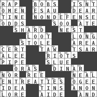 ACROSS 1. Strike 4. Moves up and down 8. Is not 12. Sign of things to come 14. He sold his birthright 15. Letter starter 16. Prong on a fork 17. Unrelated to defense, as in spending 20. Likelihood 21. "Barney Miller" actor Jack 22. Had dinner 23. Broken piece 27. A home for chicks 29. Spoils 31. Yearn 34. Fur scarf 35. Length times width 36. Foregone conclusion 39. The 23rd letter of the Hebrew alphabet 41. Russian ruler of old 42. Toward shelter 43. Debaucheries 46. Corncob 47. Turn sharply 48. Mouths or openings 51. Middle Eastern gold or silver currency 54. Not either 56. Portuguese money of account (variant) 58. Anneal 61. Pleas 66. Double curve, resembling the letter S 67. It may be bright or harebrained 68. Airtight sealed metal containers 69. Soon (poet.) 70. Old wives' tales, e.g. 71. Helper 72. Also DOWN 1. Printing process, for short 2. Among 3. Hangs 4. Benjamin's nick name 5. Bear (Spanish) 6. Bar 7. Beer foam 8. Binary compound 9. Elected representatives 10. Political cartoonist Thomas 11. Relationship diagram 13. Soft 18. Age 19. Enemy 24. The first octave above the treble staff 25. Friend of Pooh 26. Stupid person 28. Narrow boards 30. Pulls apart 32. Teachers' org. 33. Slender fish 34. Navigate 36. Head covering 37. Connecticut Ivy Leaguer 38. News announcer 40. Rampant 44. Fr. "Yes" 45. "___ Little Indians" 49. "We ___ not amused" (Victoria) 50. Ocean 52. Small Philippine buffalo 53. Canadian anthropologist Darnell 54. Famous astronaut Armstrong 55. Southwest Nigerian state 57. Singer James 59. A really long time 60. Grant temporary use of 62. Actress Charlotte 63. One more than two 64. Conclusion 65. Compass dir.