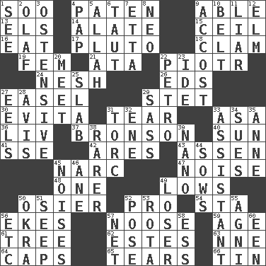 ACROSS 1. "Barney Miller" actor Jack 4. Eucharist need 9. Competent 13. Raised railways 14. Having winglike extensions 15. To provide with a ceiling 16. Erode 17. Greek god of the underworld 18. Burrowing marine mollusk 19. Opposite of masc. 21. "One Day ___ Time" 22. Peter (Polish) 24. Soft 26. Begley and Asner 27. Artist's stand 29. Proofreading order 30. Webber/Rice musical 31. Pull apart 33. White ___ sheet 36. 54 in ancient Rome 37. "Death Wish" actor 40. Player for Phoenix 41. Compass dir. 42. Ancient Greek god of war 43. NE Netherlands city 45. Drug cop 47. Annoying sound 48. Single 49. Coldest temperatures 50. Flexible twig of a willow tree 52. Adept person 54. R.R. building 56. Supplements with great effort 57. Trap for birds or small mammals 59. Personal question 61. Relationship diagram 62. _____ Park, CO 63. Compass dir. 64. Balmoral and tarboosh 65. Pulls apart 66. Metal container DOWN 1. Observe 2. Norwegian king 3. Clearly or manifestly demonstrative 4. Infant food 5. Assad's deity 6. Drawn tight 7. Singer James 8. Modern: prefix 9. Buttonhole 10. Waist strap 11. One who doesn't tell the truth 12. Shade tree 20. Rendezvous 22. Stone: prefix 23. Binary compound 25. Broad, flat, thick piece 27. Snakelike fish 28. Deliberation 29. Backtalk 31. Torque (variant) 32. Compass dir. 33. Helper 34. Takes to court 35. Singer Murray 38. Less widely known 39. Billionth: prefix 44. Sty mamas 45. Annoying sounds 46. One (Scot) 49. Failure 50. Gumbo ingredient 51. Ooze 52. Airs 53. Round or rotation of duties 55. Hindu god of fire 56. And so on (abbr.) 57. Fish or hair follower 58. Double-curved letter 60. Car or cant ending