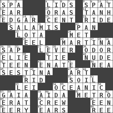 ACROSS 1. Health resort 4. Flaplike coverings 8. Petty quarrel 12. Ewer handle 13. Mouths or openings 14. Hyperbolic tangent 15. _ Allan Poe 18. Penny 19. Travel on an animal 20. Deli grouping 22. Baking dish 23. Globular water bottle used in Asia 24. Was introduced to 25. Snakelike fish 26. Chrissie's court nemesis 30. Plant excrement 33. Prying instrument 36. Scent 37. Writer Wiesel 39. Make a knot 40. Unadorned 41. Adolescent 42. Maternal 44. Teachers' org. 45. French poetic form 47. Tate display 50. To free from 51. Earth 53. Flowery wreath 54. Pertaining to the sea 57. Greek goddess of the earth (variant) 59. Opera by Verdi 61. Paris' subway 63. Part of Q.E.F. 64. Group working together 65. Car or cant ending 66. Suggestive of the supernatural 67. Hearing organs 68. To riddle DOWN 1. Observe 2. Groovy apts. 3. Therefore, facetiously 4. Venues 5. Angers 6. Daniel's nick name 7. Fast jet (abbr.) 8. Ski resort town in Vermont 9. Ache 10. Plus 11. Definite Article 16. Medicinal plant 17. Pace 21. Shopping center 22. For each 24. Make imperfect 26. Rendezvous 27. Goddess of spring and wife of Bragi 28. Thickened enlargement 29. Length times width 30. Puts into a specified state 31. Toward shelter 32. Sliced desserts 34. Inactive volcano in Sicily 35. By way of 38. Plea 42. Conclusion 43. Comfort 46. One more than two 48. Wander aimlessly 49. Prong on a fork 52. 61 cubic inches 53. One who doesn't tell the truth 54. River in Europe 55. Crow sounds 56. Algonquian 57. Turn to the right 58. "We ___ not amused" (Victoria) 59. Adept person 60. Retirement account (abbr.) 62. Single