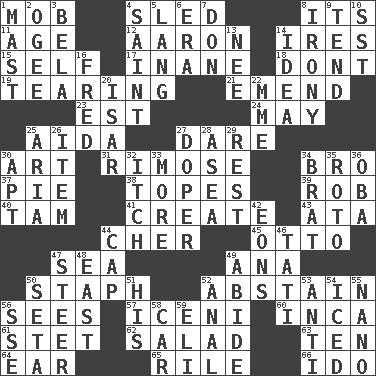 ACROSS 1. Disorderly crowd 4. Downhill vehicle 8. ___ a Wonderful Life 11. Grow older 12. Composer Copland 14. Angers 15. Itself 17. Silly 18. Do not 19. Pulling into pieces 21. Make improvements or corrections to 23. Eastern Standard Time (abbr.) 24. Can I? 25. Opera by Verdi 27. Have the gumption 30. Tate display 31. Full of chinks, cracks, or crevices 34. Sis' sibling 37. Sliced dessert 38. Drinks excessively 39. Director Reiner 40. Scottish cap 41. Cause to be 43. _ moment's notice (2 wds.) 44. "Mermaids" star 45. "Beetle Bailey" pooch 47. Ocean 49. Santa ___, CA 50. Staphylococcus 52. Refrain by choice 56. Perceives with the eye 57. Ancient Celtic tribe of eastern Britain 60. South American Indian 61. Proofreading order 62. Vegetable dish 63. Nine, plus one 64. Hearing organ 65. Cause heat under the collar 66. Wedding promise DOWN 1. Vertical spar for supporting sails 2. Double curve, resembling the letter S 3. Actor Lugosi 4. Virtuous person 5. Long (Scottish) 6. Epoch 7. Spanish title 8. Literary sarcasm 9. Be inclined (to) 10. Fast jet (abbr.) 13. Born 14. It may be bright or harebrained 16. Flintstone 20. Austrian river, tributary to the Danube 22. Madame (abbr.) 25. Operatic vocal solo 26. A distinct part 27. Drug addict 28. At sea 29. State of inaction 30. Fitting 32. Hankering 33. Greater amount 34. Naughty child 35. Printing process, for short 36. Chief or king in Benin or Nigeria 42. Immeasurably long periods of time 44. Head covering 46. Jacques of French films 47. Bull 48. Compass direction 49. Stay 50. Bristle 51. Part of HMS, perhaps 52. Of or related to the anus 53. Against 54. On the rocks 55. Billionth: prefix 56. Compass dir. 58. Auto 59. Connecticut Ivy Leaguer