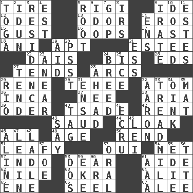 ACROSS 1. Become fatigued 5. Swiss mountan, "Queen of the Mountains" 9. Binary compound 12. Lyric poems 13. Aroma 14. Greek god of love 15. Abrupt rush of wind 16. I made a mistake 17. Political cartoonist Thomas 18. Black tropical American cuckoo 19. Fitting 21. First name in cosmetics 22. Raised platform 24. Again 26. Begley and Asner 27. Looks after 28. Arches 29. French philosopher Descartes 30. Giggle 32. Smallest unit of an element 36. South American Indian 37. Born 38. Operatic vocal solo 39. Baltic tributary 40. Sadhe (variant) 42. Monthly bill 43. Saudi Arabian king (1953-1964) 44. Hide under a false appearance 46. 100% 49. Grow older 50. Tear apart 51. Like summer trees 53. Fr. "Yes" 54. Was introduced to 57. _ china 58. Letter starter 61. Helper 62. "Death on the ____" 63. Gumbo ingredient 64. Set down 65. Compass dir. 66. Stitch closed the eyes of (a falcon) 67. Toward shelter DOWN 1. Ancient Roman robe 2. Goddess of spring and wife of Bragi 3. Dwelling 4. Eastern Standard Time (abbr.) 5. Carrot, for example 6. Wedding promise 7. Grand Old Party 8. Big collection agency 9. Feeling or showing extreme anger 10. Administered medicine 11. _____ Park, CO 14. Followers of ems 19. Help 20. Inconspicuous attention getter 21. Double-curved letter 23. Approach 24. A special lineage 25. Frozen water 27. Look after 28. Toward the future 29. River (Sp.) 31. Follow as a consequence or result 32. Composer Copland 33. Excercise machine 34. Pig sound 35. Floor protector 40. Label 41. Shade of tan 43. Declare 45. Luau accessory 46. Place in a line 47. Soviet premier 1918-24 48. Dipping utensil 52. Enemy 53. Of the mouth 55. Singer Brickell 56. Wig 58. Two (Sp.) 59. Make supply last 60. "We ___ not amused" (Victoria) 61. Auto club (abbr.)