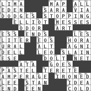 ACROSS 1. Pale green bean 5. Atlas unit 8. Everything 11. Locale of original sin 12. "Two Mules for Sister ____" 13. By way of 14. Evades 17. Ceasing 19. American author Paul (1891-1958) 21. Makes clutter 22. Aroma 23. Nonscientific branch of learning 24. Double-curved letter 27. Extremities 29. French article 32. 61 cubic inches 34. Greek goddess of the dawn 36. Israeli folk dance 37. Mountain range 38. The first octave above the treble staff 39. Hindu god of fire 40. Small valley 41. Lion 42. Killed 43. Compass dir. 44. Stupid person 46. Fish or hair follower 47. _ moment's notice (2 wds.) 50. Leaves 52. Soft color 55. Cylindrical with tapered ends 57. Electrical Measurement 59. Pressed 62. Area sheltered from the wind 63. Comedian Laurel of Laurel & Hardy 64. The content of cognition 65. Conclusion 66. Car or cant ending 67. Having a low temperature DOWN 1. Directed 2. Wedding promise 3. Ancient Persian 4. White American of non-Hispanic descent 5. Floor protector 6. Scent 7. Some stationery 8. Deliberation 9. Actor's bit 10. Straggles 12. Fast jet (abbr.) 15. A person who is older than you are 16. The Jewish people; Israel 18. Pacific Standard Time (abbr.) 20. Severe or trying experience 24. Evade 25. Begets 26. Showing deterioration from age 28. Having a sole or soles 29. Utah city north of Ogden 30. Bert's buddy 31. Virtuous person 33. Pipe bend 35. Moe Howard, for one 36. Actor Linden 42. Bull 45. Australian parrot (variant) 47. Had dinner 48. Laconic 49. Having winglike extensions 51. Unemotional 52. Diluted with white 53. So be it 54. Moved rapidly 55. Nine, plus one 56. Inside; within (prefix) 58. Separate the seeds from cotton 60. Snakelike fish 61. Male parent