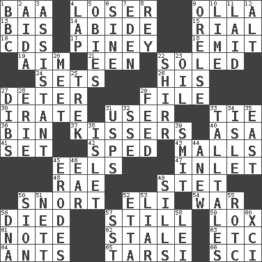 ACROSS 1. Sound made by sheep 4. Failure 9. Spanish pot 13. Twice 14. Remain 15. Monetary unit of Yemen 16. Music discs 17. Abounding in pines 18. Give off 19. Direct toward a target or goal 21. Car or cant ending 22. Having a sole or soles 24. Arranges properly for use 26. Part of HMS, perhaps 27. Prevent from occurring 29. Do some clerical work 30. Feeling or showing extreme anger 31. One who uses or employs something 33. Make a knot 36. Storage container 37. Smoochers 40. White ___ sheet 41. Put into a specified state 42. Hurried 43. Promenades 45. Snakelike fish 47. An arm off of a larger body of water 48. Actress Charlotte 49. Proofreading order 50. Derisive sound 52. Connecticut Ivy Leaguer 54. Armed conflict 56. Passed on 57. Not moving 59. Brine-cured salmon 61. Observe 62. Lacking originality or spontaneity 63. And so on (abbr.) 64. Pismires 65. Tarsus (plural) 66. _-fi DOWN 1. English channel? 2. Opera by Verdi 3. Helper 4. Pet locale 5. Off-Broadway awards 6. Trig term 7. Locale of original sin 8. Marina Del _, California 9. Threatening words 10. Welles in "The Third Man" 11. Put down 12. Keyboard modifier key 20. Confront 22. Bake eggs in their shells 23. Lubricate 25. Long journey 27. Claim 28. One of the Great Lakes 29. Nourish 31. United States Postal Service (abbr.) 32. Compass dir. 33. Baron Munchausen's specialties 34. Small island 35. Compass direction 38. Small island 39. Stricken, poetically 44. Afresh 45. Eats (away) 46. Hearing organ 49. Beverly of Met fame 50. The Jewish people; Israel 51. Remaining after all deductions 52. Singer James 53. One who doesn't tell the truth 55. College mil. group 56. Heredity factor (abbr.) 57. Fast jet (abbr.) 58. Luau accessory 60. One more than ninety