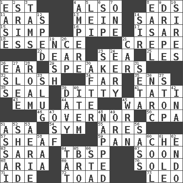ACROSS 1. Eastern Standard Time (abbr.) 4. In addition 8. Begley and Asner 11. Caspian sea tributary 13. Chow _ 14. Indian skirt 15. Simple or foolish person 16. Corncob 17. Austrian river, tributary to the Danube 18. Gist 21. Streamer paper 22. Letter starter 23. Ocean 25. French article 26. Hearing organ 29. Orators 32. Agitate, as a liquid 34. At a great distance 35. Followers of ems 38. Lick closed 39. Simple song 41. Jacques of French films 43. Australian flightless bird 44. Had dinner 45. Make _____ (do battle with) 46. State head 50. Tax preparer (abbr.) 51. White ___ sheet 54. Symbol (abbr.) 55. Ancient Greek god of war 57. To gather and bind into a bundle 59. Flamboyance 63. "Two Mules for Sister ____" 64. Cook's measure (abbr.) 67. Within a short period 68. Roberta Peters solo 69. Johnson of "Laugh-In" 70. Disposed of to a purchaser 71. Binary compound 72. Frog relative 73. Lion DOWN 1. Comfort 2. Indian titles of respect 3. Scottish caps 4. Electrical Unit 5. Flowery wreath 6. Small drink 7. Single 8. Artist's stand 9. Window treatment 10. Begets 12. Broke a traffic law 14. Title for a knight 19. Delicate 20. Head covering 21. Automobile 23. Three-handed card game 24. Suggestive of the supernatural 26. Curvy letter 27. Toward shelter 28. Wander 30. Following 31. Stalk of a moss capsule 33. Snaillike creature with no shell 36. Drug cop 37. Obstruct or block passage 39. American folk hero Crockett 40. A whole individual unit 42. _ tizzy (2 wds.) 45. Songbird 47. Order of Saint Francis (abbr.) 48. Slept 49. Mouth or opening 51. Slender Brazilian palm 52. Broken piece 53. Nest on high 56. Backtalk 58. Auto club (abbr.) 60. Calm and collected 61. Opening into or through something 62. Inside; within (prefix) 64. Make lace 65. Sis' sibling 66. R.R. building