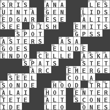 ACROSS 1. Indian titles of respect 5. Santa ___, CA 8. French article 11. National forest in Provo, Utah 13. Commissioned military rank (abbr.) 14. Flaplike coverings 15. _ Allan Poe 16. Compass dir. 17. Came down and settled, as after flight 18. Observe 19. Food container 21. Sends forth 22. Blemish 24. Global Positioning Systems (abbr.) 25. Michaelmas daisies 27. White ___ sheet 29. Travels 30. Dodge 32. Inside; within (prefix) 33. Cell (Danish) 35. "____ silly question..." 39. Arguments over trivial matters 41. Proofreading order 42. Curve 43. Develop 45. Sew up the eyelids of hawks and falcons 48. Root beer relative 49. Something which is sent 50. Parka part 52. Three (prefix) 55. Jai ____ 56. Being at a high temperature 57. Keyboard key 59. Wig 60. The first octave above the treble staff 61. Biscuitlike quick bread 62. Binary compound 63. Lion 64. Singles DOWN 1. Takes to court 2. Travel on an animal 3. Consumed 4. R.R. building 5. Grows older 6. Delicate 7. A saturated hydrocarbon 8. Ms. Damita and namesakes 9. Proofreads 10. Fast planes 12. Zeal 14. Desk light 20. ___ a Wonderful Life 21. Mild oath 23. Mexican monetary units 25. Ripen 26. Boy, to dad 27. Everything 28. Institute legal proceedings 30. Raised railways 31. Artist's stand 33. 4-wheeled motor vehicle 34. And so on (abbr.) 36. Ski resort town in Vermont 37. Barrel 38. Had dinner 40. Diluted with white 43. Environmental prefix 44. Methods 45. Having a sole or soles 46. Related on the mother's side 47. Singer Brickell 49. Suttee (variant) 50. Opening into or through something 51. "Beetle Bailey" pooch 53. French philosopher Descartes 54. Angers 56. Actor Linden 58. Non-commissioned officer (abbr.)
