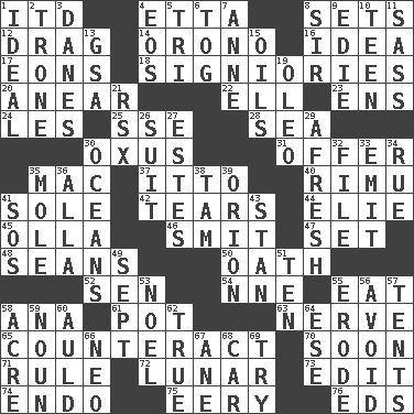 ACROSS 1. It would 4. Singer James 8. Arranges properly for use 12. To be drawn or hauled along 14. U. of Maine site 16. The main thing one is thinking about 17. Immeasurably long periods of time 18. Seigniories (variant) 20. Approach 22. Pipe bend 23. Followers of ems 24. French article 25. Compass dir. 28. Ocean 30. The longest river in Central Asia 31. Auction bid 35. Apple computer (short form) 37. "Tell ____ the Marines!" 40. Tall New Zealand timber tree 41. Flatfish 42. Separates forcefully 44. Writer Wiesel 45. Spanish pot 46. Stricken, poetically 47. Put into a specified state 48. Actors Connery and Penn 50. Pledge 52. Elected rep. 54. Compass dir. 55. Consume 58. Santa ___, CA 61. Cooking vessel 63. Effrontery 65. Frustrate 70. Within a short period 71. General guideline 72. Type of eclipse 73. Prepare for publication 74. Inside; within (prefix) 75. Suggestive of the supernatural 76. Begley and Asner DOWN 1. Standard of perfection 2. Heavy duty weighing machine 3. Natives or inhabitants of Denmark 4. Greek goddess of the dawn 5. Three (prefix) 6. Coat; cloak 7. Singer Murray 8. Title for a knight 9. Singer Brickell 10. Adolescent 11. Backtalk 13. Girls' org. (abbr.) 15. Lubricates 19. Butter sub 21. Acura sports coupe 26. Set of matching outer garments 27. _____ Park, CO 29. Anew 30. Seas 32. Do some clerical work 33. Give off 34. Regret 35. Undercover agent 36. Silent film actress Nazimova 38. Scottish cap 39. Constellation of myth 41. Distress signal 43. Comedian Laurel of Laurel & Hardy 49. Back-to-school mo. 51. "___ Little Indians" 53. Christmas carol 55. Wear away 56. Keep away from 57. Portable shelters 58. Land measure 59. Part of speech 60. Old (Scot.) 62. Loyal 64. Compass dir. 66. Modern: prefix 67. A saturated hydrocarbon 68. Auto 69. Attempt to accomplish something