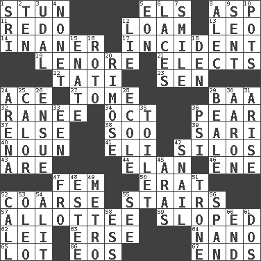 ACROSS 1. Astound 5. Raised railways 8. Cleo's killer 11. Make new 12. Rich soil 13. Lion 14. More empty; more void 17. Event 19. Poe poem 21. Opts 22. Jacques of French films 23. Elected rep. 24. Adept person 27. Heavy book 29. Sound made by sheep 32. Indian princess (variant) 34. Sep. follower 36. Lightbulb-shaped fruit 37. Otherwise 38. "Barney Miller" actor Jack 39. Indian skirt 40. Part of speech 41. Connecticut Ivy Leaguer 42. Grain storage towers 43. "We ___ not amused" (Victoria) 44. Liveliness 46. Compass dir. 47. Opposite of masc. 50. Part of Q.E.F. 52. Unrefined 55. Flight of steps 57. One to whom something is allotted 59. Slanted 62. Flowery wreath 63. Celtic language 64. Billionth: prefix 65. Car dealer's back yard 66. Greek goddess of the dawn 67. Extremities DOWN 1. _ Lanka 2. Nine, plus one 3. Allodial 4. Music written for nine 5. Age 6. Shoestrings 7. Grin 8. Actor Baldwin 9. Posted 10. Plant holders 12. Whopper 15. Maternal 16. Printing process, for short 18. Lair 20. Full of chinks, cracks, or crevices 24. Sports stadium 25. Bodily heat indicating an inflammation 26. Follow as a consequence or result 28. Learning spot: Fr. 29. Memphis, Tenn. Street 30. Composer Copland 31. Originate 33. Car or cant ending 35. Bathroom 36. Air pressure measure (abbr.) 42. Slow-paced one 45. Caspian sea tributary 47. Back 48. First name in cosmetics 49. Paris' subway 51. Heavy duty weighing machine 52. Give a ring to 53. Margarine 54. Set down 55. Observe 56. Connect, as a bridge 58. Curvy letter 60. Conclusion 61. Two (Sp.)
