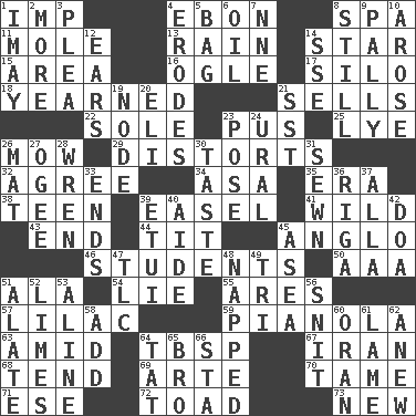 ACROSS 1. Naughty child 4. Inky black, to poets 8. Health resort 11. Undercover agent 13. Precipitation 14. Play the lead 15. Type of rug 16. Stare at amorously 17. Grain storage tower 18. Had a strong desire 21. Makes a sale 22. Not divided or shared with others 23. Fluid product of inflammation 25. Sodium hydroxide 26. Cut the grass 29. What propaganda does 32. Match 34. White ___ sheet 35. Period 38. Adolescent 39. Artist's stand 41. Rampant 43. Conclude 44. Teat (slang) 45. White American of non-Hispanic descent 46. SAT takers 50. American Automobile Association (abbr.) 51. Wing 54. Falsehood 55. Ancient Greek god of war 57. Pale purple color 59. Player piano 63. Among 64. Cook's measure (abbr.) 67. SW Asia republic 68. Watch over 69. Johnson of "Laugh-In" 70. Not wild 71. Compass dir. 72. Frog relative 73. ___ Haven, CT DOWN 1. "If ____ say so..." 2. Greater amount 3. Entreaty 4. Eats (away) 5. Container for groceries 6. Petroleum 7. Compass dir. 8. Not moving 9. Chummy 10. Came up 12. Hearing organs 14. Compass dir. 19. Connecting point 20. Connecticut Ivy Leaguer 21. Fast jet (abbr.) 23. Airs 24. Mountain range 26. Floor protector 27. Double curve, resembling the letter S 28. Songbird 30. Clothes sense 31. Stitched 33. Extremities 36. Port city in Latvia 37. Silent film actress Nazimova 39. Needle holder 40. Helper 42. ___ good deed 45. At sea 47. Affectionate concern, for short 48. Slept 49. Three (prefix) 51. Having winglike extensions 52. Citrus fruits 53. Place in a line 56. In a ____ (agitated or irritated) 58. Say or write further 60. Northwest Algerian city 61. Unable to walk 62. Afresh 64. Make lace 65. Sis' sibling 66. R.R. building