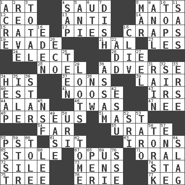 ACROSS 1. Nonscientific branch of learning 4. Saudi Arabian king (1953-1964) 8. Floor coverings 12. Corporate head (abbr.) 13. Opposed to 14. Small Philippine buffalo 15. Assign a rank or rating to 17. Sliced desserts 18. Dice game 19. Dodge 21. Actor Linden 23. French article 24. Voters do this 26. Pass on 28. Christmas carol 30. Contrary to your interests or welfare 34. Part of HMS, perhaps 37. Immeasurably long periods of time 39. Den 40. Eastern Standard Time (abbr.) 41. Trap for birds or small mammals 43. Big collection agency 44. Actor Alda or Thicke 46. It was, poetically 47. Born 48. Son of Zeus who helped slay Medusa 51. Vertical spar for supporting sails 54. At a great distance 55. A salt of uric acid 58. Pacific Standard Time (abbr.) 61. Be seated 63. Removes the wrinkles 65. Fur scarf 67. Musical composition 71. Relating to the mouth 72. Drop; flow; fall 73. Not women's 74. R.R. building 75. Family _ (genealogy) 76. One of the Great Lakes 77. Barrel DOWN 1. 1/640 square mile 2. Break or tear apart 3. Add up to 4. Plant excrement 5. Black tropical American cuckoo 6. Shoshoni 7. Food container 8. Impair 9. Of or related to the anus 10. Drink excessively 11. Backtalk 16. Locale of original sin 18. 154 in Roman numerals 20. Environmental prefix 22. Find the sum of 25. Adolescent 27. Snakelike fish 29. Plunders 30. Indian state 31. Precipitation 32. Male parent of an animal 33. Celtic language 34. Pile 35. Capri or Wright 36. Play the lead 38. At this time 42. Son of Isaac 45. Overdraft (abbr.) 49. Comfort 50. RI univ. 52. Indian title of respect (Mr.) 53. Pacific island yam 56. Cod relative 57. Related on the mother's side 58. Inconspicuous attention getter 59. Use a swizzle stick 60. Lacquered or enameled metalware 62. Heavy book 64. Volcanic refuse 66. Area sheltered from the wind 68. For each 69. Corn or form start 70. Compass dir.