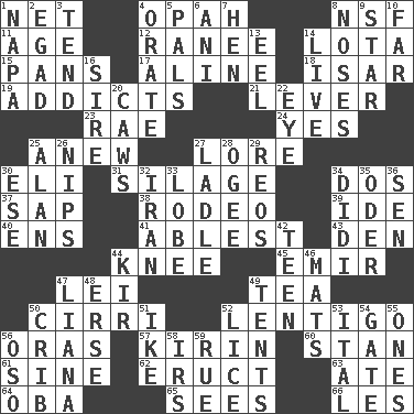 ACROSS 1. Fish or hair follower 4. Brightly colored fish 8. Overdraft (abbr.) 11. Ripen 12. Indian princess (variant) 14. Globular water bottle used in Asia 15. Baking dishes 17. Place in a line 18. Austrian river, tributary to the Danube 19. Inveterate users 21. Crowbar 23. Actress Charlotte 24. Affirmative reply 25. Afresh 27. Old wives' tales, e.g. 30. Biblical high priest 31. Fodder prepared in a silo 34. Two (Sp.) 37. Plant excrement 38. Cowboy competition 39. Binary compound 40. Followers of ems 41. Most capable 43. Lair 44. Leg joint 45. Independent ruler or chieftain 47. Luau accessory 49. Afternoon social gathering 50. High-altitude cloud 52. Small, flat, pigmented spot on the skin 56. Mouths or openings 57. Japanese brewing company 60. Comedian Laurel of Laurel & Hardy 61. Trig term 62. Spew [out] 63. Had dinner 64. Chief or king in Benin or Nigeria 65. Perceives with the eye 66. French article DOWN 1. California wine valley 2. Mild oath 3. Watch over 4. Speak pompously 5. Friends 6. Cuckoo 7. Layer 8. Olfactory organs 9. Play the lead 10. Distant 13. Snakelike fish 14. Not recorded 16. Father 20. Crow sounds 22. Sight organ 25. ____ Jay Lerner 26. Cuts off 27. Dipping utensil 28. Double curve, resembling the letter S 29. Vintage cars 30. Compass dir. 32. SW Asia republic 33. Ear part 34. "You Light Up My Life" star Conn 35. River in Europe 36. Elected rep. 42. Adolescent 44. Apertif with cassis 46. Floor coverings 47. Climbing, woody, usually tropical vines 48. Celtic language 49. Portable shelters 50. Baby bed with high sides 51. Mamie's mate 52. Louse (plural) 53. Slanted text style (abbr.) 54. Yard entry 55. Washington bills 56. Bear (Spanish) 58. Big collection agency 59. Sorrow