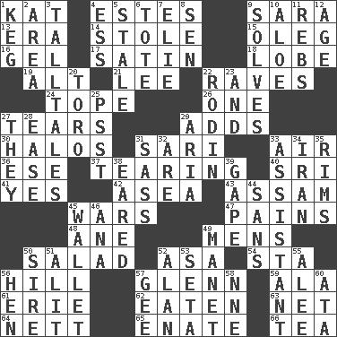 ACROSS 1. Krazy ___ of comics 4. _____ Park, CO 9. "Two Mules for Sister ____" 13. Epoch 14. Fur scarf 15. Cassini of fashion 16. Set 17. Smooth fabric 18. Ear part 19. Keyboard modifier key 21. Area sheltered from the wind 22. All-night dance parties 24. Drink excessively 26. Single 27. Pulls apart 29. Sums up 30. Rings 31. Indian skirt 33. Atmosphere 36. Compass dir. 37. Pulling into pieces 40. _ Lanka 41. Affirmative reply 42. Toward the sea 43. Indian state 45. Armed conflicts 47. Aches 48. A saturated hydrocarbon 49. Not women's 50. Vegetable dish 52. White ___ sheet 54. R.R. building 56. Land elevation 57. American astronaut and politician John 59. Insect wing 61. One of the Great Lakes 62. Ingested 63. Fish or hair follower 64. Remaining after all deductions 65. Related on the mother's side 66. Beverage made from leaves DOWN 1. Cask 2. Type of rug 3. Baron Munchausen's specialties 4. Curvy letter 5. Lacking originality or spontaneity 6. Carry 7. Writer Wiesel 8. Elected rep. 9. Finds the solution 10. _ vera 11. Confederate soldiers (slang) 12. Ripen 20. "Corrida" creature 22. "The Thinker" sculptor 23. Plus 25. Inconspicuous attention getter 27. Those people 28. Relaxation 29. Operatic vocal solo 31. Backtalk 32. "We ___ not amused" (Victoria) 33. Helper 34. SW Asia republic 35. Basketball hoops 38. Having ears or earlike features 39. Open wide 44. Without 45. Place for singles 46. Santa ___, CA 49. French painter Edouard 50. Father 51. Set down 52. Actor Alda or Thicke 53. Stalk of a moss capsule 55. Toward shelter 56. Layer 57. Turn to the right 58. Compass dir. 60. "One Day ___ Time"