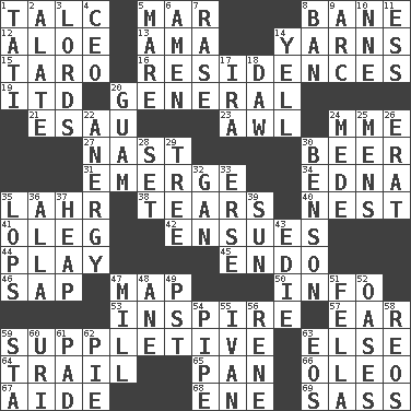 ACROSS 1. Baby powder 5. Spoil 8. Object of repulsion 12. Medicinal plant 13. Nursemaid (var.) 14. Entertaining tales 15. Edible starchy tuberous root 16. Dwellings 19. It would 20. Commissioned military rank 21. He sold his birthright 23. Leather borer 24. Madame (abbr.) 27. Political cartoonist Thomas 30. Fermented drink made from hops 31. Develop 34. Pulitzer Prize-winning author Ferber 35. Cowardly lion portrayer 38. Lacerates 40. Egg locale 41. Cassini of fashion 42. Takes place subsequently 44. Romp 45. Inside; within (prefix) 46. Plant excrement 47. Atlas unit 50. A message received and understood 53. Stimulate to action 57. Hearing organ 59. Supplying deficiencies 63. Otherwise 64. Go after with the intent to catch 65. Baking dish 66. Margarine 67. Assistant 68. Compass dir. 69. Backtalk DOWN 1. Jacques of French films 2. Having winglike extensions 3. Domineers 4. Corporate head (abbr.) 5. Female horse 6. So be it 7. To erase 8. Bar 9. Curve 10. Compass dir. 11. Double-curved letter 14. Shout 17. Retirement account (abbr.) 18. Simpleton 20. Island territory of the United States 22. Disorder of the immune system 24. Ancient Persian 25. Not women's 26. Part of Q.E.F. 28. Arrange properly for use 29. Woody plant 30. Gillaume's butler role 32. Separate the seeds from cotton 33. Celtic language 35. Chops off 36. Silent film actress Nazimova 37. Pile 39. Player for Phoenix 43. Singer Brickell 47. Place where flour is made 48. A saturated hydrocarbon 49. Pacific Standard Time (abbr.) 51. Chap (slang) 52. Fertile tracts in a desert 54. Corncob 55. _ the terrible 56. French philosopher Descartes 58. Vintage cars 59. R.R. building 60. RI univ. 61. Groovy apt. 62. Sliced dessert 63. Greek goddess of the dawn