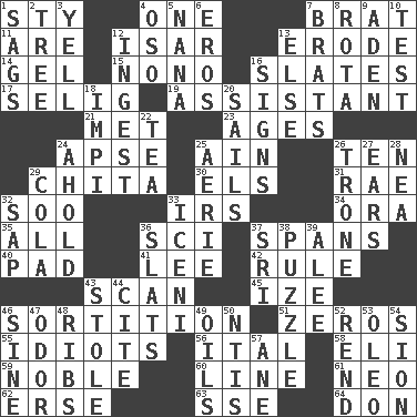 ACROSS 1. Filthy place 4. Single 7. Naughty child 11. "We ___ not amused" (Victoria) 12. Austrian river, tributary to the Danube 13. Eat (away) 14. Set 15. Words to Nanette 16. Chalkboards 17. Former Milwaukee Brewers owner Bud 19. Helper 21. Was introduced to 23. Ripens 24. Domed church section 25. The 18th letter of the Arabic alphabet 26. "___ Little Indians" 29. Riviera of "Kiss of the Spider Woman" 30. Raised railways 31. Actress Charlotte 32. "Barney Miller" actor Jack 33. Big collection agency 34. Mouth or opening 35. Everything 36. _-fi 37. Connects, as a bridge 40. Writing tablet 41. Area sheltered from the wind 42. General guideline 43. Examine hastily 45. Ending with capital 46. Casting lots 51. Nothings 55. Foolish or stupid persons 56. Slanted text style (abbr.) 58. Connecticut Ivy Leaguer 59. Impressive in appearance 60. Actor's bit 61. Modern: prefix 62. Celtic language 63. Compass dir. 64. Spanish title DOWN 1. Sinks 2. Woody plant 3. Shout 4. Bear (Spanish) 5. Grandmother 6. Greek god of love 7. Naughty children 8. Roll call or roster of names 9. Arabian gulf 10. Trial 12. Swallow 13. Otherwise 16. Omens 18. Body of Kaffir warriors 20. Travel by water 22. Afternoon social gathering 24. Hold, grip (Informal) 25. Nest on high 26. Heavy duty weighing machine 27. Hearing organs 28. Teachers' org. 29. Root beer relative 32. Plant excrement 33. Ancient Celtic tribe of eastern Britain 36. Narrow boards 37. Indian title of respect (Mr.) 38. What's this? 39. Toward shelter 43. Fur scarf 44. Quote 46. Trig term 47. Aroma 48. Chest bones 49. Lubricates 50. Nuclear Threat Initiatives 52. Tear apart 53. Margarine 54. The Jewish people; Israel 57. A saturated hydrocarbon