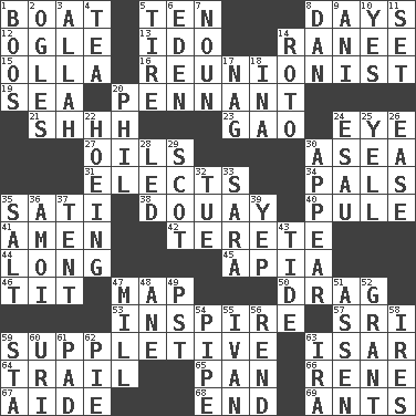 ACROSS 1. Water vessel 5. "___ Little Indians" 8. 24-hour periods 12. Stare 13. Wedding promise 14. Indian princess (variant) 15. Water jar 16. One who advocates reunion 19. Ocean 20. Pre-World Series prize 21. Quiet! 23. E Mali city 24. Sight organ 27. Petroleums 30. Toward the sea 31. Opts 34. Friends 35. Suttee (variant) 38. A city in N France, SE of Calais 40. Whine 41. So be it 42. Cigar-shaped 44. Having great length 45. Capital of Western Samoa 46. Teat (slang) 47. Atlas unit 50. To trail on the ground 53. Heighten or intensify 57. Indian title of respect (Mr.) 59. Supplementary 63. Austrian river, tributary to the Danube 64. Hang back 65. Baking dish 66. French philosopher Descartes 67. Helper 68. Conclude 69. Pismires DOWN 1. Scornful sounds 2. Stares 3. Assad's deity 4. Beverage made from leaves 5. Hoop that covers a wheel 6. Locale of original sin 7. Part of speech 8. One of the 12 tribes of Israel 9. Black tropical American cuckoo 10. Consenting reply 11. Put into a specified state 14. Printing process, for short 17. Tired old horse 18. _ tizzy (2 wds.) 20. Silvers or Donahue 22. Weeding 24. He sold his birthright 25. Shout 26. Comfort 28. Directed 29. Native of Scotland 30. Seem 32. Third day of the wk. 33. "Two Mules for Sister ____" 35. Table seasoning 36. Mine, in Marseilles 37. Portable shelter 39. Slangy assent 43. Periodic rise and fall of the sea level 47. Place where flour is made 48. A saturated hydrocarbon 49. Pacific Standard Time (abbr.) 51. NE Netherlands city 52. Monetary aid 54. Corncob 55. _ the terrible 56. Tear apart 58. Angers 59. R.R. building 60. RI univ. 61. Writing tablet 62. Sliced dessert 63. Lyricist Gershwin