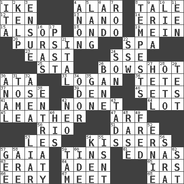 ACROSS 1. Mamie's husband 4. Having or resembling wings 8. Story 12. Nine, plus one 13. Billionth: prefix 14. One of the Great Lakes 15. Columnist Joseph or Stewart 18. Southwest Nigerian state 19. Chow _ 20. Puckering 22. Health resort 23. 90 degrees 24. Compass dir. 25. R.R. building 26. The distance a bow sends an arrow 30. _ moment's notice (2 wds.) 33. Utah city north of Ogden 36. False hair 37. Characteristic smell of wine 39. Lair 40. Puts into a specified state 41. So be it 42. Music written for nine 44. Car dealer's back yard 45. Cordwainer's material 47. Sandy's bark 50. River (Sp.) 51. Have the gumption 53. French article 54. Smoochers 57. Greek goddess of the earth (variant) 59. Airtight sealed metal containers 61. Ferber et al. 63. Part of Q.E.F. 64. Arabian gulf 65. Big collection agency 66. Suggestive of the supernatural 67. Confront 68. Erode DOWN 1. Call ___ day 2. Seaweed 3. Follow as a consequence or result 4. Soon (poet.) 5. Austrian-born American filmmaker Fritz 6. Added to 7. Friend of Pooh 8. Storms 9. Type of rug 10. Cards in a Roman deck? 11. Car or cant ending 16. Mouths or openings 17. Inconspicuous attention getter 21. Slanted text style (abbr.) 22. Compass dir. 24. Boy, to dad 26. Object of repulsion 27. The bottom of a shoe or boot 28. Von Bismarck 29. Trial 30. Of or related to the anus 31. Heavy book 32. Toward the sea 34. Scent 35. Commissioned military rank (abbr.) 38. Plea 42. Modern: prefix 43. Bits 46. Part of HMS, perhaps 48. To erase 49. Flintstone 52. Bert's buddy 53. One who doesn't tell the truth 54. Leg joint 55. Is not 56. "Two Mules for Sister ____" 57. Unit of force equal to gravity 58. "We ___ not amused" (Victoria) 59. Scottish cap 60. Binary compound 62. Fast jet (abbr.)