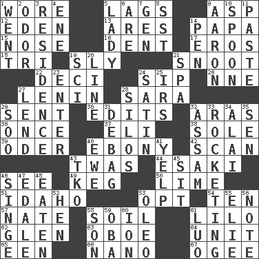 ACROSS 1. Had on 5. Straggles 9. Viper 12. Genesis locale 13. Ancient Greek god of war 14. Dad 15. Sense of smell 16. Gouge 17. Greek god of love 18. Three (prefix) 19. Wily 21. Snout, nose 22. Tenth: prefix 24. Small drink 26. Compass dir. 27. Soviet premier 1918-24 28. "Two Mules for Sister ____" 29. Emitted 30. Prepares for publication 32. Ancient river in northeast Turkey 36. Single time 37. Connecticut Ivy Leaguer 38. Not divided or shared with others 39. Baltic tributary 40. Dark wood 42. Examine hastily 43. It was, poetically 44. 1973 Nobel Price Winner (Physics) Leo 46. Perceive with the eye 49. Barrel 50. Welles in "The Third Man" 51. Potato state 53. Choose 54. Nine, plus one 57. Nathan's nickname 58. Earth 61. _ and Stitch 62. Small, secluded valley 63. Mitch Miller's instrument 64. A single undivided whole 65. Car or cant ending 66. Billionth: prefix 67. Double curve, resembling the letter S DOWN 1. Left 2. Aroma 3. Dwelling 4. Compass dir. 5. Kenny Rogers chart-topper in '80 6. "We ___ not amused" (Victoria) 7. Commissioned military rank (abbr.) 8. Fast jet (abbr.) 9. Composer Copland 10. Soup utensil 11. Thick mixture 14. Fenced enclosure 19. _-fi 20. Actor's bit 21. Health resort 23. Keyboard key 24. Smooth fabric 25. Big collection agency 27. Grant temporary use of 28. Grain storage towers 29. "Barney Miller" actor Jack 31. Debunk (Brit. slang) 32. Indian state 33. Shooting up abruptly 34. Jai _ 35. Elected rep. 40. She-sheep 41. Sharp bark 43. Ring climax 45. Be seated 46. Burn superficially 47. Peak District village in England 48. Eroded 52. Layer 53. Margarine 55. Writer Wiesel 56. Short letter 58. Male child 59. Chief or king in Benin or Nigeria 60. Electrically charged atom 61. Nilotic language