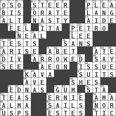 ACROSS 1. Bear (Spanish) 4. Navigate 9. Entreaty 13. Again 14. Speak pompously 15. Austrian-born American filmmaker Fritz 16. The first octave above the treble staff 17. Difficult 18. Assistant 19. Snakelike fish 21. Call ___ day 22. Stone: prefix 24. Actress Patricia 26. Area sheltered from the wind 27. Trials 29. Without 30. Originate 31. Collude with 33. Had dinner 36. HTML Container Element 37. Moved like an arrow 40. Declare 41. Observe 42. A really long time 43. Come out of 45. Polynesian shrub of the pepper family 47. Sets or collections 48. "___ Maria" 49. "______ My Girl" (Turtles hit) 50. Ferber et al. 52. Chewing product 54. R.R. building 56. Beverages made from leaves 57. Bert's buddy 59. Wet nurse (var.) 61. _ mater 62. Moves on water 63. Or not 64. United States Postal Service (abbr.) 65. _____ Park, CO 66. Nervous spasm DOWN 1. Chief or king in Benin or Nigeria 2. Drop; flow; fall 3. Clearly or manifestly demonstrative 4. Male offspring 5. Lag or linger behind 6. 90 degrees 7. Singer James 8. Marina Del _, California 9. Food holders 10. Den 11. Inside; within (prefix) 12. Ripen 20. Allows 22. Food holder 23. Car or cant ending 25. Toward the sea 27. Small boys 28. One of the Great Lakes 29. Stitched 31. Length times width 32. Oct. 31 cry 33. Aide 34. Pulled tight 35. Snake ____ (dice throw) 38. All-night dance parties 39. Food container 44. Takes to court 45. Sunflower state 46. Actress Gardner 49. Grin 50. Snakelike fish 51. Moist 52. Pate de foie ____ 53. A single undivided whole 55. Mine, in Marseilles 56. The 19th letter of the Greek alphabet 57. Compass dir. 58. Curvy letter 60. Curve