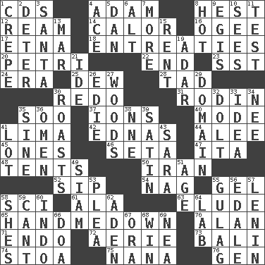 ACROSS 1. Music discs 4. First of billions? 8. Behest 12. 480, 500 or 516 sheets of paper 14. Bodily heat indicating an inflammation 16. Double curve, resembling the letter S 17. Inactive volcano in Sicily 18. Pleas 20. _ dish (used to culture cells) 22. Conclude 23. Fast jet (abbr.) 24. Period 25. Morning condensation 28. Small boy 30. Redecorate 31. "The Thinker" sculptor 35. "Barney Miller" actor Jack 37. Charged atoms 40. Method 41. Pale green bean 42. Ferber et al. 44. Toward shelter 45. Singles 46. Bristle 47. Call ___ day 48. Portable shelters 50. SW Asia republic 52. Small drink 54. Tired old horse 55. Set 58. _-fi 61. In the manner of 63. Evade 65. Sleeping bag shop? 70. Actor Alda or Thicke 71. Inside; within (prefix) 72. Nest on high 73. Indonesian resort city 74. Portico 75. Grandmother 76. Commissioned military rank (abbr.) DOWN 1. Streamer paper 2. Prevent from occurring 3. Before Barbara or Clara 4. Adept person 5. One of the 12 tribes of Israel 6. Keyboard modifier key 7. Greater amount 8. Being at a high temperature 9. The front part of a cuirass 10. Observes 11. Trial 13. Third mo. 15. Monthly bill 19. The sixth month of the Jewish calendar 21. Binary compound 26. Singer Brickell 27. Forest 29. Kingdom 30. Exposes to great heat 32. Stupid person 33. It may be bright or harebrained 34. Born 35. Trig term 36. Presage 38. Compass dir. 39. Smooth fabric 41. Car dealer's back yard 43. "Two Mules for Sister ____" 49. Thailand, formerly 51. Ripen 53. Entreaty 55. Russian prison camp 56. Peak District village in England 57. Soviet premier 1918-24 58. "______ My Girl" (Turtles hit) 59. Patter 60. _ china 62. An important port of Yemen 64. Experiment locale 66. ___ good deed 67. Mouth or opening 68. Acquire through effort 69. Teachers' org.