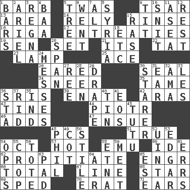 ACROSS 1. Sharp remark 5. It was, poetically 9. Russian ruler of old 13. Length times width 14. Have confidence or faith in 15. Remove soap 16. Port city in Latvia 17. Pleas 19. Elected rep. 20. Arrange properly for use 21. It is 22. Make lace 23. Desk light 25. Adept person 26. Having ears or earlike features 30. Lick closed 34. Contemptuous expression 35. Not wild 36. Indian titles of respect 39. Maternal 42. Caspian sea tributary 43. Prong on a fork 44. Peter (Polish) 46. Sums up 47. Take place subsequently 48. Personal Computers (abbr.) 51. Loyal 54. Sep. follower 57. Being at a high temperature 58. Australian flightless bird 60. Binary compound 62. Appease 65. Engineer (abbr.) 66. Add up to 67. Actor's bit 68. Play the lead 69. Drove too fast 70. Part of Q.E.F. 71. Hearing organs DOWN 1. Oblong pieces of solid material 2. Satellite of Uranus 3. Rain (Swedish) 4. Sound made by sheep 5. Family _ (genealogy) 6. Left 7. The first octave above the treble staff 8. Damascus' land 9. Teat (slang) 10. In a ____ (agitated or irritated) 11. At sea 12. State of inaction 15. Raze (variant) 18. And so on (abbr.) 20. Connect, as a bridge 24. Makes clutter 27. To separate or throw off 28. Car or cant ending 29. Window treatment 30. A viewer who gazes fixedly 31. Hearing organ 32. Wet nurse (var.) 33. French article 36. R.R. building 37. To free from 38. Working for oneself (abbr.) 40. Shallow baking pan 41. Greek goddess of the dawn 45. Ballerina skirt 48. Silvers or Donahue 49. Small bed 50. Vertical member of a panel or frame 52. National forest in Provo, Utah 53. _ Allan Poe 54. Chooses 55. Riding implement 56. Lug 58. Inactive volcano in Sicily 59. Confront 61. Blunders 63. Groovy apt. 64. Atmosphere 65. Compass dir.