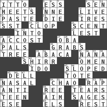 ACROSS 1. "Tell ____ the Marines!" 5. Curvy letter 8. Elected rep. 11. Confronts 13. Compass dir. 14. Moving, as bait 15. Thick mixture 16. Pass on 17. Angers 18. Fast jet (abbr.) 19. Hoof sound 21. Odor 22. To the inside or interior of 24. For fear that 25. Buttonhole 27. Chief or king in Benin or Nigeria 29. Friends 30. Takes hold of 32. Relationship diagram 33. Phillipine bananalike plant 35. Nanny 39. Bake eggs in their shells 41. Sign of things to come 42. Wedding promise 43. Had an oblique or slanted direction 45. Small valley 48. Carryall 49. Relating to the nose 50. US Secretary of Labor Elaine L. _ 52. Reproach for some lapse or misdeed 55. Against 56. Portuguese money of account (variant) 57. Pulls into pieces 59. Adolescent 60. Direct toward a target or goal 61. Gurus 62. Compass dir. 63. Raised railways 64. Repose DOWN 1. Naughty children 2. Beverages made from leaves 3. A testis 4. Baseball player Mel 5. Inside; within (prefix) 6. Clip 7. Observe 8. Male parents of animals 9. Incident 10. A home for chicks 12. Religious groups 14. Louse (plural) 20. Car dealer's back yard 21. Broad, flat, thick piece 23. Olfactory organs 25. Fitting 26. 4-wheeled motor vehicle 27. The grampus (Milton) 28. Sound made by sheep 30. Slender fish 31. Snob 33. Assist 34. Sis' sibling 36. Electrical Measurement 37. Born 38. Plus 40. Land elevation 43. R.R. building 44. Plunders 45. Natives or inhabitants of Denmark 46. First name in cosmetics 47. (Had) reclined 49. Nathan's nickname 50. To provide with a ceiling 51. Equivocates 53. Ancient Greek god of war 54. Inconspicuous attention getter 56. Actress Charlotte 58. Ewer handle