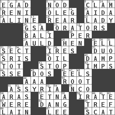 ACROSS 1. Mild oath 5. Allow head to fall sleepily 8. Dollar (slang) 12. Painter Guido (1575-1642) 13. Cassini of fashion 15. Opera by Verdi 16. Place in a line 18. Rump 19. Kenny Rogers chart-topper in '80 20. Girls' org. (abbr.) 22. Speakers 24. Indonesian resort city 26. For each 27. Old (Scot.) 28. Layer 29. Pipe bend 32. Religious group 35. Angers 37. Superhero pair 38. Indian titles of respect 39. Lubricate 40. Moist 41. Small child 42. Cease 43. Naughty children 44. Compass dir. 45. Two (Sp.) 46. Snakelike fish 49. American Automobile Association (abbr.) 50. Carrot, for example 51. Nineveh was its capital 55. Non-commissioned officer (abbr.) 56. Caspian sea tributary 57. Inactive volcano in Sicily 59. Feeling or showing extreme anger 63. We are 64. Mild oath, euphamism for damn 65. Unclean, religiously 66. (Had) reclined 67. Area sheltered from the wind 68. Scram! DOWN 1. Period 2. Set 3. Black tropical American cuckoo 4. Empty-headed or silly people 5. Not either 6. Butter sub 7. Letter starter 8. Bodily heat indicating an inflammation 9. One who doesn't tell the truth 10. Does sums 11. Fifth month 14. Wine fruits 17. He sold his birthright 21. Everything 23. "___ Little Indians" 25. Foolish or stupid persons 28. Aide 29. Dutch treat 30. Mass 31. Chops off 32. Fast planes 33. Greek god of love 34. Quote 36. River (Sp.) 40. What propaganda does 42. Flew 45. 24 hours 47. A really long time 48. Venues 49. NE Netherlands city 51. Type of rug 52. Indian skirt 53. Slanted text style (abbr.) 54. Queen of England 1702-14 56. Leather borer 58. Mature 60. Curve 61. Afternoon social gathering 62. Bank Draft (abbr.)