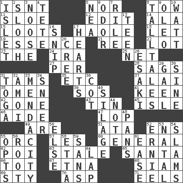 ACROSS 1. Is not 5. Not either 8. Pull behind 11. _ gin 12. Prepare for publication 14. In the manner of 15. Plunders 17. White Person, in Hawaii 18. Allow 19. Gist 21. To separate or throw off 22. Car dealer's back yard 23. Definite Article 24. Lyricist Gershwin 25. Fish or hair follower 27. For each 28. Droops 31. Scottish caps 35. And so on (abbr.) 37. Jai ____ 38. Sign of things to come 39. Distress signal 41. Peachy ____! 42. Went 43. Metal container 45. Small island 46. Assistant 47. Chop off 49. "We ___ not amused" (Victoria) 51. _ moment's notice (2 wds.) 52. Followers of ems 55. The grampus (Milton) 57. French article 60. Commissioned military rank 62. Luau course 63. Lacking originality or spontaneity 65. Before Barbara or Clara 66. Small child 67. Inactive volcano in Sicily 68. Thailand, formerly 69. Filthy place 70. Viper 71. Snakelike fish DOWN 1. Small island 2. Agitate, as a liquid 3. Trap for birds or small mammals 4. False hair 5. Teachers' org. 6. Aroma 7. Cause heat under the collar 8. Baron Munchausen's specialties 9. Butter sub 10. Electrical Unit 13. Adolescent 16. Sever or remove by pinching or nipping 17. Centers of feelings and intuitions 20. Algonquian 26. 1973 Nobel Price Winner (Physics) Leo 29. Highlander 30. Trig term 31. Ancient Roman robe 32. Mine, in Marseilles 33. Ananias' fault 34. Scornful expression 36. Small bed 40. Fodder prepared in a silo 44. Short letter 48. Baking dishes 50. Otherwise 52. Bert's buddy 53. Relating to or accompanying birth 54. Hits or strikes with great force 55. Chooses 56. Carrot, for example 58. Singer James 59. Without 61. Relaxation 64. Pet locale