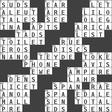 ACROSS 1. Beer foam 5. Hearing organ 8. Allow 11. Eskimo relative 13. "We ___ not amused" (Victoria) 14. _ and Stitch 15. Falsehoods 16. Perceive with the eye 17. Cassini of fashion 18. _ tizzy (2 wds.) 19. Tenement units (abbr.) 21. N. Chile seaport 22. Bits 24. For fear that 25. Bathroom plumbing fixture 27. Sorrow 29. Greek god of love 30. Flat circles 32. Billionth: prefix 33. Miss Universe 1986, Barbara Palacios _ 35. Puff or smoke 39. Give a jingle 41. Deliberation 42. She-sheep 43. Electrical Unit 45. Habitations of wild animals 48. Cowardly lion portrayer 49. It is permitted: Lat. 50. Connect, as a bridge 52. Actress Charlotte 55. Small Philippine buffalo 56. Health resort 57. Peak District village in England 59. Promenade 60. Elected rep. 61. "_____ Recall" 62. Before (prefix) 63. Begley and Asner 64. Elected reps. DOWN 1. Suttee (variant) 2. ____ Bator 3. Conveyance 4. Take to court 5. Compass direction 6. Ancient Greek god of war 7. Portuguese money of account (variant) 8. Ms. Damita and namesakes 9. Opt 10. Ancient Roman robe 12. Sadhe (variant) 14. Old wives' tales, e.g. 20. Pacific Standard Time (abbr.) 21. Actor Baldwin 23. Columnist Joseph or Stewart 25. "___ Little Indians" 26. Mouth or opening 27. To free from 28. Purpose 30. Color 31. Staphylococcus 33. Pull behind 34. Compass dir. 36. Make much ado about nothing 37. Apertif with cassis 38. Compass dir. 40. Command 43. According to 44. French painter Edouard 45. Middle Eastern gold or silver currency 46. Learning spot: Fr. 47. Be tempered by heat 49. Desk light 50. Moved rapidly 51. Baking dishes 53. ____ Jay Lerner 54. Snakelike fish 56. Compass dir. 58. Two (Sp.)