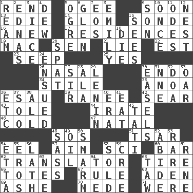 ACROSS 1. Tear apart 5. Double curve, resembling the letter S 9. Within a short period 13. Singer Brickell 14. Take by theft 15. Message 16. Afresh 17. Homes 19. Apple computer (short form) 20. Elected rep. 21. Whopper 22. Eastern Standard Time (abbr.) 23. Ooze 25. Affirmative reply 26. Rhinal 30. Inside; within (prefix) 34. Vertical member of a panel or frame 35. Small Philippine buffalo 36. Son of Isaac 39. The wife of a rajah (variant) 42. Scorch 43. Lacquered or enameled metalware 44. Feeling or showing extreme anger 46. Lacking warmth 47. Relating to or accompanying birth 48. Distress signal 51. Russian ruler of old 54. Snakelike fish 57. Direct toward a target or goal 58. _-fi 60. Soap unit 62. Interpreter 65. Hoop that covers a wheel 66. Lugs 67. Court order 68. Arabian gulf 69. American tennis player Robert 70. Ancient Persian 71. Past tense of be (plural) DOWN 1. 480, 500 or 516 sheets of paper 2. Ferber et al. 3. Sibling's daughter 4. Morning condensation 5. Legendary monster 6. Small, secluded valley 7. Greek goddess of the dawn 8. Poet Dickinson 9. Male child 10. At one time in the past 11. Lyric poems 12. A home for chicks 15. Perceives with the eye 18. Expire 20. Argument over a trivial matter 24. Took place subsequently 27. Title for a knight 28. Chicken ___ king 29. Soviet premier 1918-24 30. Artist's stands 31. Compass dir. 32. ___ good deed 33. Rowing implement 36. And so on (abbr.) 37. "Barney Miller" actor Jack 38. 100% 40. Epoch 41. Consume 45. Jacques of French films 48. Backtalk 49. Lubricate 50. Excessive but superficial compliments 52. Tolerate 53. More valued for its uncommonness 54. Singer James 55. Greek god of love 56. Thin strip of wood or metal 58. Exchanged or delivered for money 59. Algonquian 61. French philosopher Descartes 63. Born 64. Third day of the wk. 65. The 23rd letter of the Hebrew alphabet