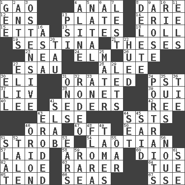ACROSS 1. E Mali city 4. Of or related to the anus 8. Have the gumption 12. Followers of ems 13. Food holder 14. 4th largest of the Great Lakes 15. Singer James 17. Locates 18. Hang loosely or laxly 19. French poetic form 21. College papers 23. Teachers' org. 24. Shade tree 26. Shoshoni 27. Son of Isaac 28. Toward shelter 30. Biblical high priest 31. Spoke pompously 34. Pacific Standard Time (abbr.) 37. 54 in ancient Rome 38. Music written for nine 39. Fr. "Yes" 40. Area sheltered from the wind 41. Spring feasts 42. To sift 43. Otherwise 44. Fast planes 46. Mouth or opening 47. Often (poetically) 50. Hearing organ 51. Disco prop 54. Of or relating to Laos or its people 57. Put down 58. Scent 60. "Vaya con ____" 62. _ vera 63. Less widely known 64. Third day of the wk. 65. Watch over 66. Oceans 67. Compass dir. DOWN 1. Turn to the right 2. Pismires 3. Clearly or manifestly demonstrative 4. Place in a line 5. Brizilian seaport 6. Had dinner 7. For fear that 8. Erase 9. Came up 10. Cause heat under the collar 11. Snakelike fish 13. Air pressure measure (abbr.) 16. At sea 20. The 19th letter of the Greek alphabet 22. Took on color 25. Mother 27. Writer Wiesel 29. Allows 30. Pipe bend 31. Singles 32. Cowboy competition 33. A saturated hydrocarbon 34. Likenesses of persons 35. Institutes legal proceedings 36. Standoff 41. Broad, flat, thick piece 43. Worn away 44. Arrange properly for use 45. Alleged 46. Constellation of myth 48. Plants 49. Corrects by punishment or discipline 51. Narrow board 52. Story 53. Hearing organs 55. Boat paddle 56. Common sense 59. Actress Charlotte 61. Observe