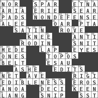 ACROSS 1. Not either 4. Coast Guard woman 8. Inactive volcano in Sicily 12. Roberta Peters solo 14. One of the Great Lakes 15. Singe 16. Groovy apts. 17. Unrelated to defense, as in spending 20. Toward shelter 21. Boat paddle 22. Parent Teacher Assoc. 23. Smooth fabric 27. Be footloose 29. Leg joint 31. Opposed to 34. "The Thinker" sculptor 35. In a ____ (agitated or irritated) 36. Ancient Persian 39. Pet locale 41. Sight organs 42. Singles 43. Literary convention 46. Waist strap 47. He sold his birthright 48. American tennis player Robert 51. Proofreads 54. Fish or hair follower 56. "___ Maria" 58. Swiss mountan, "Queen of the Mountains" 61. The property of being fit to eat 66. Greek god of love 67. Small Philippine buffalo 68. Tenth: prefix 69. Peachy ____! 70. Long (Scottish) 71. Sever or remove by pinching or nipping 72. Fast jet (abbr.) DOWN 1. California wine valley 2. Spoken 3. Amusement-park features 4. Elected rep. 5. Adept person 6. The 18th letter of the Arabic alphabet 7. Redecorate 8. Compass dir. 9. 3-inch nail 10. Political cartoonist Thomas 11. Length times width 13. Toward the sea 18. Hearing organ 19. From 24. Ring climax 25. Working for oneself (abbr.) 26. Famous astronaut Armstrong 28. Flower holders 30. Related on the mother's side 32. Make a knot 33. ___ a Wonderful Life 34. Musical pauses 36. Crowd into 37. Compass dir. 38. Conveyance 40. Introduce or present, as a question 44. Groovy apt. 45. Fr. "Yes" 49. Actor Linden 50. First lady 52. Long journey 53. Founders of families 54. Be tempered by heat 55. Pulitzer Prize-winning author Ferber 57. Conclusions 59. Moves 60. Is not 62. Container for groceries 63. Car or cant ending 64. _-fi 65. Small drink