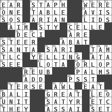 ACROSS 1. Ewer handle 4. Staphylococcus 9. Past tense of be (plural) 13. Single 14. Eating place 15. Deliberation 16. Mayday 17. Believer in; advocate of (suffix) 18. Flaplike coverings 19. Direct toward a target or goal 21. Filthy place 22. Cell (Danish) 24. Tenth: prefix 26. "We ___ not amused" (Victoria) 27. Navigate 29. Blind as ____ 30. Before Barbara or Clara 31. Indian skirt 33. Scottish cap 36. Affectionate concern, for short 37. Crying or shouting loudly 40. "One Day ___ Time" 41. Perceive with the eye 42. Globular water bottle used in Asia 43. Fourth or lowest deck 45. Reuben's nickname 47. Insides of hands 48. Find the sum of 49. Inconspicuous attention getter 50. Laconic 52. Leather borer 54. Consume 56. Indonesian resort city 57. Relatively large 59. Lion 61. A single undivided whole 62. Letch 63. And so on (abbr.) 64. Those things 65. Slender Brazilian palm 66. Put into a specified state DOWN 1. Greek goddess of the dawn 2. Small Philippine buffalo 3. Home 4. R.R. building 5. Tarsus (plural) 6. "This won't hurt ____!" 7. Live dramatic performance 8. Layer 9. Place for singles 10. Tending to cause great harm 11. Travel on an animal 12. Double-curved letter 20. Confront 22. Small house or cottage 23. Period 25. Supercomputer manufacturer 27. Fast planes 28. Lie 29. Roberta Peters solo 31. Oscar Madison type 32. Keyboard modifier key 33. Baron Munchausen's specialties 34. Tiny particle 35. Atlas contents 38. Evade 39. Republicans 44. Raze (variant) 45. Noteworthy scarcity 46. Begley and Asner 49. Beach, in Buenos Aires 50. Hyperbolic tangent 51. Writer Wiesel 52. Ancient river in northeast Turkey 53. Moistens 55. Wig 56. Yet 57. Girls' org. (abbr.) 58. Three (prefix) 60. Sep. follower