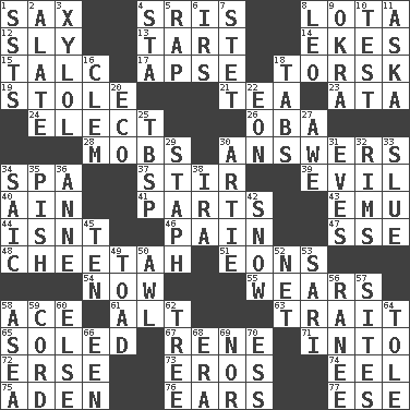 ACROSS 1. Saxophone 4. Indian titles of respect 8. Globular water bottle used in Asia 12. Secret 13. Small pie 14. Makes supply last 15. Baby powder 17. Domed church section 18. Cod relative 19. Fur scarf 21. Afternoon social gathering 23. "One Day ___ Time" 24. Voters do this 26. Chief or king in Benin or Nigeria 28. Disorderly crowds 30. Replies (to) 34. Health resort 37. Use a swizzle stick 39. Tending to cause great harm 40. The 18th letter of the Arabic alphabet 41. Components 43. Australian flightless bird 44. Is not 46. Ache 47. Compass dir. 48. Leopard's kin 51. Immeasurably long periods of time 54. Immediately 55. Puts on (as clothing) 58. Adept person 61. Keyboard modifier key 63. Distinguishing feature 65. Having a sole or soles 67. French philosopher Descartes 71. To the inside or interior of 72. Celtic language 73. Greek god of love 74. Snakelike fish 75. Arabian gulf 76. Hearing organs 77. Compass dir. DOWN 1. Fast planes 2. Having winglike extensions 3. Xylene (variant) 4. R.R. building 5. Hit sharply and swiftly 6. Big collection agency 7. Proofreading order 8. Lion 9. Gumbo ingredient 10. Trial 11. "____ silly question..." 16. To starve (Brit.) 18. Bar bills 20. Environmental prefix 22. A really long time 25. Cook's measure (abbr.) 27. Deep reverence 29. Staphylococcus 30. Nick name for Arthur 31. Nights before holidays 32. Basketball hoops 33. Turn sharply 34. Ketch in the Levant 35. Expression of disdain 36. Singer Murray 38. Lyricist Gershwin 42. Frozen precipitation 45. "___ Little Indians" 49. Frog relative 50. Leather borer 52. Fish or hair follower 53. Indian skirt 56. Indian princess (variant) 57. Settings 58. Toward the sea 59. Drawstring 60. Otherwise 62. Family _ (genealogy) 64. Lacquered or enameled metalware 66. Car or cant ending 68. Period 69. And not 70. Double-curved letter