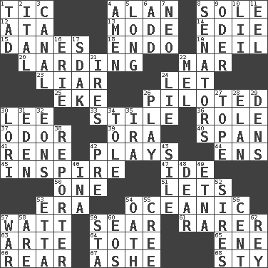 ACROSS 1. Nervous spasm 4. Actor Alda or Thicke 8. Flatfish 12. _ moment's notice (2 wds.) 13. Method 14. Singer Brickell 15. Natives or inhabitants of Denmark 18. Inside; within (prefix) 19. Famous astronaut Armstrong 20. Preparing or cooking with lard 22. Make imperfect 23. One who doesn't tell the truth 24. Allow 25. Supplement with great effort 26. Manned the helm 30. Area sheltered from the wind 33. Vertical member of a panel or frame 36. Hero or heavy, e.g. 37. Aroma 39. Mouth or opening 40. Connect, as a bridge 41. French philosopher Descartes 42. Romps 44. Followers of ems 45. Stimulate to action 47. Binary compound 50. Single 51. Allows 53. Epoch 54. Pertaining to the sea 57. Electrical Unit 59. Dry up 61. Less widely known 63. Johnson of "Laugh-In" 64. Carryall 65. Compass dir. 66. Stern 67. American tennis player Robert 68. Filthy place DOWN 1. Small boy 2. Slanted text style (abbr.) 3. Lessep's creation 4. So be it 5. Yearn 6. Say or write further 7. Modern: prefix 8. Elected representatives 9. River in Europe 10. Cards in a Roman deck? 11. Snakelike fish 16. One of the Great Lakes 17. Neighbor of Neb. 21. Angers 22. Cartoonist voice _ Blanc 24. Whopper 26. Shaw product 27. Drink excessively 28. Flair 29. Lairs 30. Australian parrot (variant) 31. Locale of original sin 32. Immeasurably long periods of time 34. Lacquered or enameled metalware 35. Retirement account (abbr.) 38. News announcer 42. Before (prefix) 43. Filth; sediment 46. _ tizzy (2 wds.) 48. Letter starter 49. Inactive volcano in Sicily 52. Fathers 53. Singer James 54. Pledge 55. Algonquian 56. Penny 57. Armed conflict 58. "We ___ not amused" (Victoria) 59. R.R. building 60. Greek goddess of the dawn 62. Marina Del _, California