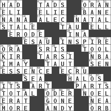 ACROSS 1. Possessed 4. Small amounts or degrees 8. NW Algerian seaport 12. Biblical high priest 13. Writer Wiesel 14. Object of repulsion 15. Nanny 17. Actor Baldwin 18. Relating to or accompanying birth 19. Having lost freshness 21. The 19th letter of the Greek alphabet 23. Pipe bend 24. Eat (away) 26. _ tizzy (2 wds.) 28. Son of Isaac 30. Heighten or intensify 34. Mouth or opening 37. Indian titles of respect 39. Utensil 40. Apertif with cassis 41. Tarsus (plural) 43. Basketball assoc. 44. "If ____ say so..." 46. Drawn tight 47. Elected rep. 48. Center 51. Shade of tan 54. Ocean 55. Saint headwear 58. It is 61. Nonscientific branch of learning 63. Actors' quests 65. "_____ Recall" 67. Baltic tributary 71. Christmas carol 72. Part of Q.E.F. 73. Went 74. Teachers' org. 75. Greater amount 76. Actor Griffith 77. Globe DOWN 1. Coop moms 2. Having winglike extensions 3. Middle Eastern gold or silver currency 4. Afternoon social gathering 5. Everything 6. Pass on 7. Religious group 8. Chief or king in Benin or Nigeria 9. Pace 10. Of or related to the anus 11. 1994 drama film starring Jodie Foster 16. _ vera 18. Religious women 20. Begley and Asner 22. The 18th letter of the Arabic alphabet 25. 90 degrees 27. Fitting 29. A salt of uric acid 30. Come out of 31. Charged atoms 32. Loose flowing garment 33. Liveliness 34. Migrant worker of the '30s 35. Basketball hoops 36. Caspian sea tributary 38. Lyricist Gershwin 42. Hankering 45. It is so 49. Be tempered by heat 50. Automobile 52. Strike 53. ____ Bator, Mongolia 56. U. of Maine site 57. Bull 58. Detail 59. "Corrida" creature 60. Play the lead 62. Ancient Roman robe 64. Broad, flat, thick piece 66. Had dinner 68. Spanish title 69. Conclusion 70. Marina Del _, California