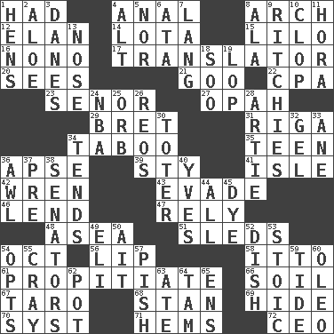 ACROSS 1. Possessed 4. Of or related to the anus 8. Bowlike part 12. Liveliness 14. Globular water bottle used in Asia 15. _ and Stitch 16. Words to Nanette 17. Interpreter 20. Perceives with the eye 21. Thick or sticky substance 22. Accounting whiz (abbr.) 23. Sir (Sp.) 27. Brightly colored fish 29. Cy Young winner Saberhagen 31. Port city in Latvia 34. Off limits 35. Adolescent 36. Domed church section 39. Filthy place 41. Capri or Wright 42. Songbird 43. Dodge 46. Grant temporary use of 47. Have confidence or faith in 48. At sea 51. Bobsleighs 54. Sep. follower 56. Mouth edge 58. "Tell ____ the Marines!" 61. Appease 66. Land 67. Edible starchy tuberous root 68. Comedian Laurel of Laurel & Hardy 69. Flintstone garb 70. System (abbr.) 71. Cloth borders 72. Corporate head (abbr.) DOWN 1. Coop moms 2. Medicinal plant 3. Natives or inhabitants of Denmark 4. Keyboard modifier key 5. Not either 6. _ moment's notice (2 wds.) 7. Long (Scottish) 8. Wing 9. Actors Guy, Robert Welles, and Clint 10. Hoof sound 11. Israeli folk dance 13. Olfactory organ 18. "Barney Miller" actor Jack 19. Trim (branches) 24. Basketball assoc. 25. Globe 26. Vintage cars 28. Nick name for Arthur 30. Carrier 32. Set 33. A saturated hydrocarbon 34. Is inclined (to) 36. Leather borer 37. Before (prefix) 38. Legislators 40. Jacques Cousteau's middle name 44. Everything 45. Color 49. Biblical high priest 50. Small island 52. Food container 53. Unemotional 54. Chooses 55. Supercomputer manufacturer 57. Expression of disdain 59. Periodic rise and fall of the sea level 60. Butter sub 62. Plant holder 63. Had dinner 64. Scottish cap 65. Followers of ems