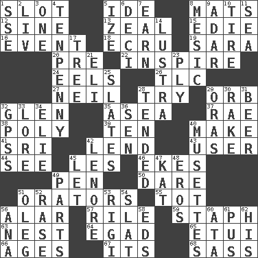 ACROSS 1. Narrow opening 5. Binary compound 8. Floor protectors 12. Trig term 13. Ardor 15. Singer Brickell 16. Incident 18. Shade of tan 19. "Two Mules for Sister ____" 20. Before (prefix) 22. Heighten or intensify 24. Snakelike fish 26. Affectionate concern, for short 27. Famous astronaut Armstrong 28. Attempt 29. Globe 32. Small, secluded valley 35. Toward the sea 37. Actress Charlotte 38. Much (prefix) 39. Nine, plus one 40. Cause to be 41. Indian title of respect (Mr.) 42. Grant temporary use of 43. One who makes use of a thing 44. Perceive with the eye 45. French article 46. Makes supply last 49. Animal enclosure 50. Have the gumption 51. Speakers 55. Small child 56. Having or resembling wings 57. Cause heat under the collar 59. Staphylococcus 63. Egg locale 64. Mild oath 65. Needle holder 66. Ripens 67. ___ a Wonderful Life 68. Backtalk DOWN 1. Compass dir. 2. 54 in ancient Rome 3. Single 4. 3-inch nail 5. Ending with capital 6. Tenth: prefix 7. Merit 8. Of or pertaining to a meson 9. The sixth month of the Jewish calendar 10. Hoop that covers a wheel 11. Ocean 14. A period of five years 17. Family _ (genealogy) 21. Connecticut Ivy Leaguer 23. Travel a route regularly 25. Chalkboards 28. Looked after 29. Mouths or openings 30. Libertine 31. Fermented drink made from hops 32. Global Positioning Systems (abbr.) 33. Old wives' tales, e.g. 34. Writer Wiesel 36. Elected rep. 40. French bagpipes 42. Poe poem 45. Allow 47. Krazy ___ of comics 48. Greek god of love 49. Components 51. Cassini of fashion 52. To erase 53. Swiss mountan, "Queen of the Mountains" 54. Narrow board 56. Santa ___, CA 58. Begley and Asner 60. _ moment's notice (2 wds.) 61. Tenth month of the Hindu calendar 62. Part of HMS, perhaps