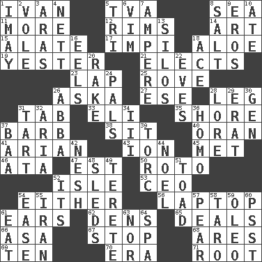 ACROSS 1. _ the terrible 5. Federal power corp. 8. Ocean 11. Greater amount 12. Basketball hoops 14. Tate display 15. Having winglike extensions 17. Body of Kaffir warriors 18. Medicinal plant 19. Next before 21. Chooses 23. Pet locale 25. Be footloose 26. "____ silly question..." 27. Compass dir. 28. Part of a journey 31. Bar bill 33. Connecticut Ivy Leaguer 35. Dinah or Pauly 37. Sharp remark 38. Be seated 40. Northwest Algerian city 41. Believer in; advocate of (suffix) 43. Electrically charged atom 45. Was introduced to 46. _ moment's notice (2 wds.) 47. Eastern Standard Time (abbr.) 50. Printing process, for short 52. Capri or Wright 53. Corporate head (abbr.) 54. One or the other of two 56. Portable computer 61. Hearing organs 62. Habitations of wild animals 65. Allots cards 66. White ___ sheet 67. Cease 68. Ancient Greek god of war 69. "___ Little Indians" 70. Epoch 71. Carrot, for example DOWN 1. "If ____ say so..." 2. Grand slam 3. Ancient river in northeast Turkey 4. Remaining after all deductions 5. Three (prefix) 6. Zeal 7. Electrical Unit 8. Table seasoning 9. Greek god of love 10. Had dinner 13. Grain storage towers 16. Snakelike fish 18. Adept person 20. Immoral or dissolute person 22. Nights before holidays 24. Friends 26. Swedish rock group 28. Old wives' tales, e.g. 29. Part of Q.E.F. 30. Commissioned mil. rank 31. Small pie 32. Roberta Peters solo 34. One more than two 36. Same (prefix) 37. Sound made by sheep 39. Torque (variant) 42. Tender 44. Christmas carol 48. Bobsleighs 49. Cylindrical with tapered ends 51. Frog relative 52. It is 54. Relaxation 55. SW Asia republic 57. Lightbulb-shaped fruit 58. Edible starchy tuberous root 59. Butter sub 60. Inconspicuous attention getter 61. Erode 63. Not either 64. Health resort