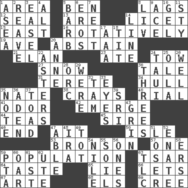 ACROSS 1. Type of rug 5. Benjamin's nick name 8. Straggles 12. Lick closed 13. "We ___ not amused" (Victoria) 14. It is permitted: Lat. 15. 90 degrees 16. Producing rotation 19. "___ Maria" 20. Choose not to consume 21. Flair 23. Had dinner 24. Pull behind 27. Frozen precipitation 30. Story 31. Cigar-shaped 34. Frame or body of a ship 35. Nathan's nickname 38. Trading vessels 40. Monetary unit of Yemen 41. Aroma 42. Develop 44. Beverages made from leaves 45. Beget 46. Conclude 47. Small island 50. Capri or Wright 53. "Death Wish" actor 57. Single 59. Census information 63. Russian ruler of old 64. Clothes sense 65. Untruth 66. Allows 67. Johnson of "Laugh-In" 68. Raised railways 69. Algonquian DOWN 1. Toward the sea 2. Rob, plunder, or pillage 3. Artist's stand 4. The first octave above the treble staff 5. Sharp remark 6. Greek god of love 7. Remaining after all deductions 8. 54 in ancient Rome 9. Adept person 10. Set 11. Filthy place 14. Actor's bit 17. American Automobile Association (abbr.) 18. Teat (slang) 20. Queen of England 1702-14 22. Michaelmas daisies 24. "Change" in Tahitian 25. Water jar 26. Not ill 28. The grampus (Milton) 29. We are 30. Threesomes 32. Scottish cap 33. Sight organs 35. Short letter 36. An important port of Yemen 37. Frog relative 39. Indian title of respect (Mr.) 43. Smile widely 47. Competent 48. Retirement account (abbr.) 49. Small child 51. Failure 52. Related on the mother's side 54. "Death on the ____" 55. Earth 56. Singles 58. Celtic language 59. Parent Teacher Assoc. 60. Rowing implement 61. Pacific Standard Time (abbr.) 62. Shoshoni 63. Affectionate concern, for short