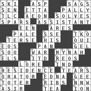 ACROSS 1. What Jean-Claude Killy likes to do 4. Viper 7. Droops 11. Elected rep. 12. Singer James 13. Chummy 14. Affectionate concern, for short 15. Period of immesurable duration 16. Finds the solution 17. Practice fights 19. Helper 21. Car or cant ending 23. Ancient Greek god of war 24. Light colored 25. Compass dir. 26. Ring climax 29. Laconic 30. Part of HMS, perhaps 31. Fr. "Yes" 32. Greek goddess of the dawn 33. Baking dish 34. Set 35. "Barney Miller" actor Jack 36. Armed conflict 37. Non-adult bird? 40. Raised railways 41. It would 42. Vintage cars 43. Old wives' tales, e.g. 45. Working for oneself (abbr.) 46. Home 51. Separates forcefully 55. Speaker 56. Pulitzer Prize-winning author Ferber 58. Unit of force equal to gravity 59. Carrier 60. Chest bones 61. Compass dir. 62. SW Saudi Arabia district 63. Beverage made from leaves 64. Electrically charged atom DOWN 1. Fast planes 2. Seaweed 3. South American Indian 4. Had dinner 5. Portico 6. Baking dishes 7. Table seasonings 8. Inventor's middle name 9. Small, secluded valley 10. System (abbr.) 12. Artist's stands 13. Introduce or present, as a question 16. Titles for men of rank and authority 18. Bring up, as a child 20. Indian antelope 22. Born 24. Mexican monetary units 25. Broken piece 26. Ancient Roman robes 27. Malaysian steamed pastry 28. Petroleum 29. Utensil 32. Compass dir. 33. Eucharist need 36. One who wires 37. Medical imaging device (abbr.) 38. Gossips 39. Thickened enlargement 43. 61 cubic inches 44. Scent 46. Roll call or roster of names 47. Greek god of love 48. Suttee (variant) 49. Sure thing 50. Singer Brickell 52. Hindu god of fire 53. Western Nevada city 54. Stitched 57. Basketball assoc.