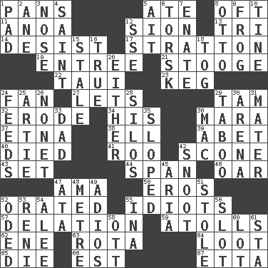 ACROSS 1. Zero-star reviews 5. Had dinner 8. Often (poetically) 11. Small Philippine buffalo 12. The Jewish people; Israel 13. Three (prefix) 14. Cease 17. Ski resort town in Vermont 19. Main course 21. Moe Howard, for one 22. "Change" in Tahitian 23. Cask 24. Avid follower 27. Allows 29. Scottish cap 32. Wear away 34. Part of HMS, perhaps 36. Hindu Mythology: god of death 37. Inactive volcano in Sicily 38. Pipe bend 39. Collude with 40. Passed on 41. Friend of Pooh 42. Biscuitlike quick bread 43. Put into a specified state 44. Connect, as a bridge 46. Rowing implement 47. Wet nurse (var.) 50. Greek god of love 52. Spoke pompously 55. Foolish or stupid persons 57. Accusation by an informer 59. Ringlike coral islands and reefs 62. Compass dir. 63. Round or rotation of duties 64. Spoils 65. Expire 66. Eastern Standard Time (abbr.) 67. Singer James DOWN 1. Writing tablet 2. One (Scot) 3. Olfactory organ 4. Inhabitant of Heaven 5. Small island 6. Cod relative 7. Maternal 8. Von Bismarck 9. Toadlike animal 10. Prong on a fork 12. Compass dir. 15. Having lost freshness 16. Loyal 18. Coat; cloak 20. One or the other of two 24. Gives food to 25. Nick name for Arthur 26. Music written for nine 28. Grain storage towers 29. Off limits 30. Sports stadium 31. Mother 33. June honoree 35. Inclined 36. Apple computer (short form) 42. Snob 45. Roberta Peters solo 47. _ moment's notice (2 wds.) 48. Distance measurement (Brit.) 49. Goodbye (Sp.) 51. Took without asking 52. Wrote a lyric poem 53. Painter Guido (1575-1642) 54. Toward shelter 55. _ tizzy (2 wds.) 56. Groove 58. Baseball player Mel 60. Car dealer's back yard 61. R.R. building