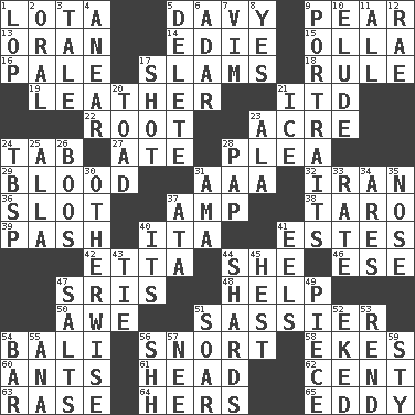 ACROSS 1. Globular water bottle used in Asia 5. American folk hero Crockett 9. Lightbulb-shaped fruit 13. Northwest Algerian city 14. Singer Brickell 15. Rounded earthenware pot or jar 16. Diluted with white 17. Shuts with force 18. General guideline 19. Cordwainer's material 21. It would 22. Carrot, for example 23. 43,560 square feet 24. Keyboard key 27. Had dinner 28. Entreaty 29. Vital fluid 31. American Automobile Association (abbr.) 32. SW Asia republic 36. Narrow opening 37. Electrical Unit 38. Pacific island yam 39. Romantic infatuation 40. Call ___ day 41. _____ Park, CO 42. Singer James 44. A female animal or person 46. Compass dir. 47. Indian titles of respect 48. Aid 50. Deep reverence 51. More impudent 54. Indonesian resort city 56. Derisive sound 58. Supplements with great effort 60. Pismires 61. Froth on beer 62. Penny 63. Raze (variant) 64. Possessive pronoun 65. Whirlpool DOWN 1. Chop off 2. Taken by mouth 3. Lie 4. Approach 5. Keyboard key 6. The sixth month of the Jewish calendar 7. Zeal 8. Consenting reply 9. Likenesses of persons 10. Dodge 11. 100% 12. Actress Charlotte 17. Attempt 20. Frog relative 21. Frozen water 23. According to 24. Cook's measure (abbr.) 25. Silent film actress Nazimova 26. Expressions of contempt or scorn 28. Infant food 30. Else 31. Housemaid (var.) 33. Pace 34. Ancient Greek god of war 35. Sense of smell 37. _ moment's notice (2 wds.) 40. ___ a Wonderful Life 41. Snakelike fish 43. Make a knot 44. Pottery fragments 45. Behest 47. Table seasonings 49. Part 51. Fly high 52. Made supply last 53. Tear apart 54. Tavern 55. Santa ___, CA 56. Quiet! 57. Born 59. Filthy place