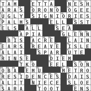 ACROSS 1. Scottish cap 4. Singer James 8. Soft 12. Caspian sea tributary 14. U. of Maine site 16. Double curve, resembling the letter S 17. Repulsive 18. Seigniories (variant) 20. Insides of hands 22. Pipe bend 23. Fast jet (abbr.) 24. Raised railways 25. Everything 28. Ocean 30. Capital of Western Samoa 31. American astronaut and politician John 35. Again 37. 43,560 square feet 40. (Had) reclined 41. Hearing organs 42. Break or tear apart 44. Small island 45. Jai _ 46. Coast Guard woman 47. Shoshoni 48. Wash lightly 50. South Vietnam president (1954) 52. Ring climax 54. Snakelike fish 55. Manchild 58. Chief or king in Benin or Nigeria 61. Australian flightless bird 63. Paris' subway 65. Homes 70. Raised platform 71. Set down 72. Sibling's daughter 73. A type of plum 74. "Two Mules for Sister ____" 75. A blast of a horn 76. Followers of ems DOWN 1. Grayish beige 2. Therefore, facetiously 3. Shopping centers 4. Greek goddess of the dawn 5. Three (prefix) 6. Coat; cloak 7. Singer Murray 8. Or not 9. The front part of a cuirass 10. Observes 11. Command 13. Symbol (abbr.) 15. Petroleums 19. Cassini of fashion 21. Plant excrement 26. One who doesn't tell the truth 27. Shoestrings 29. Plant genus of onion and garlic 30. Help 32. Compass direction 33. The longest river in the world 34. Compass dir. 35. Indonesian resort city 36. SW Asia republic 38. Strike 39. Dodge 41. Hearing organ 43. 4th largest of the Great Lakes 49. Supplemented with great effort 51. Shade tree 53. Sign of something about to happen 55. Having lost freshness 56. Greek mythologigal hunter 57. Olfactory organs 58. Mouths or openings 59. Actor Lugosi 60. SW Saudi Arabia district 62. A single undivided whole 64. Begley and Asner 66. Call ___ day 67. Corporate head (abbr.) 68. Environmental prefix 69. Arrange properly for use