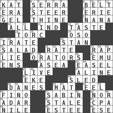 ACROSS 1. Krazy ___ of comics 4. Father Junipero _ 9. Waist strap 13. Period 14. Bull 15. 4th largest of the Great Lakes 16. Set 17. One or ones belonging to thee 18. Grandmother 19. 100% 21. Indiana (abbr.) 22. Clothes sense 24. Torque (variant) 26. Bear (Spanish) 27. Feeling or showing extreme anger 29. Comedian Laurel of Laurel & Hardy 30. First course 31. Pace 33. Hit sharply and swiftly 36. Whopper 37. Speakers 40. Australian flightless bird 41. Followers of ems 42. Toward the sea 43. Artist's stand 45. Moving, as bait 47. Place in a line 48. Supplement with great effort 49. Downhill vehicle 50. Natives or inhabitants of Denmark 52. Floor protector 54. Snakelike fish 56. Fine (Spanish) 57. Unit of acoustic absorption 59. And not 61. The sixth month of the Jewish calendar 62. Having lost freshness 63. Numbers guy (abbr.) 64. "Death on the ____" 65. First name in cosmetics 66. Compass dir. DOWN 1. Barrel 2. Type of rug 3. Baron Munchausen's specialties 4. Fast jet (abbr.) 5. Moral principle 6. It's straight from the horse's mouth 7. Tear apart 8. "We ___ not amused" (Victoria) 9. Gillaume's butler role 10. Part of Q.E.F. 11. Actor's bit 12. Afternoon social gathering 20. Globular water bottle used in Asia 22. Carrier 23. White ___ sheet 25. Do over again 27. Capri or Wright 28. Water falling in drops from the sky 29. Portico 31. To erase 32. Had dinner 33. Dwelling 34. So be it 35. Whine 38. All-night dance parties 39. Lick closed 44. Toward shelter 45. Poe poem 46. Mamie's mate 49. Vertical member of a panel or frame 50. "You Light Up My Life" star Conn 51. Of or related to the anus 52. Floor protectors 53. Blind as ____ 55. Chops off 56. Avid follower 57. Compass dir. 58. Born 60. Actress Charlotte