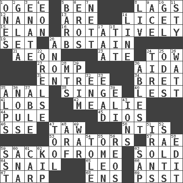 ACROSS 1. Double curve, resembling the letter S 5. Benjamin's nick name 8. Fails to keep up a pace 12. Billionth: prefix 13. "We ___ not amused" (Victoria) 14. It is permitted: Lat. 15. Liveliness 16. Rotating or pertaining to rotation 19. Arrange properly for use 20. Refrain by choice 21. A really long time 23. Had dinner 24. Pull behind 27. Frolic 30. Opera by Verdi 31. Main course 34. Cy Young winner Saberhagen 35. Of or related to the anus 38. Scorch 40. For fear that 41. Tennis shots 42. Ear of corn 44. Whine 45. "Vaya con ____" 46. Compass dir. 47. The 23rd letter of the Hebrew alphabet 50. Nuclear Threat Initiatives 53. Speakers 57. Actress Charlotte 59. Italian handbag shop? 63. Exchanged or delivered for money 64. Slow-paced one 65. Lion 66. Against 67. Canvas cover 68. Followers of ems 69. Inconspicuous attention getter DOWN 1. Washington bills 2. An organ shaped like a helmet 3. Related on the mother's side 4. Age 5. Sharp remark 6. Greek god of love 7. Remaining after all deductions 8. 54 in ancient Rome 9. Adept person 10. Set 11. Filthy place 14. Actor's bit 17. Auto club (abbr.) 18. Teat (slang) 20. At once, immediately (arch.) 22. Threatening words 24. Hoop that covers a wheel 25. Lyric poems 26. Electrical Unit 28. Mountains (abbr.) 29. Demure 30. Most capable 32. Compass dir. 33. Mild oath 35. High mountains 36. Horse sense 37. Competent 39. Connecticut Ivy Leaguer 43. Charged particles 47. Instrument 48. Sandy's bark 49. Armed conflict 51. Metal shackles 52. Table seasonings 54. Lacquered or enameled metalware 55. Sign of something about to happen 56. Vintage cars 58. Prepare for publication 59. Fast jet (abbr.) 60. Santa ___, CA 61. Automobile 62. Monetary unit of Laos 63. Plant excrement