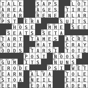 ACROSS 1. Lie 5. Plant excrements 9. Car dealer's back yard 12. Length times width 13. Ripens 14. Become fatigued 15. Located in or toward the back 16. French philosopher Descartes 17. Having or resembling wings 18. Pacific Standard Time (abbr.) 19. Period 21. Costumes for special activities 22. Flexible conduit 24. Madame (abbr.) 26. Perceive with the eye 27. Theater features 28. Stalk of a moss capsule 29. Small pie 30. Softens 32. 43,560 square feet 36. Malaysian steamed pastry 37. Floor protector 38. Supercomputer manufacturer 39. Likelihood 40. Tarsus (plural) 42. Haul 43. Mail 44. Trap for birds or small mammals 46. Chewing product 49. It is 50. Religious women 51. Wear away 53. 23rd letter of the Greek alphabet 54. Soggy 57. Merit 58. Inventor's middle name 61. Lacquered or enameled metalware 62. Portico 63. Famous astronaut Armstrong 64. 4th largest of the Great Lakes 65. Car or cant ending 66. Dutch treat 67. Arabian gulf DOWN 1. Canvas cover 2. Ancient Greek god of war 3. Resembling or made to resemble leather 4. Ewer handle 5. "Two Mules for Sister ____" 6. Mature 7. Animal enclosure 8. Compass dir. 9. Ms. Damita and namesakes 10. Speak pompously 11. Laconic 14. The 19th letter of the Greek alphabet 19. Eastern Standard Time (abbr.) 20. Take ten 21. Ocean 23. Profane or obscene expressions 24. Confronts 25. Mountains (abbr.) 27. Saudi Arabian king (1953-1964) 28. Don Adams' spy role 29. Ring climax 31. Collect or gather 32. 13-14th century defensive garment 33. What you're doing now 34. Assign a rank or rating to 35. Sight organ 40. Small child 41. Lodging establishments 43. Sliced dessert 45. Fr. "Yes" 46. Honkers 47. A salt of uric acid 48. Person of subnormal intelligence 52. Heredity factor (abbr.) 53. Inside of hand 55. Writer Wiesel 56. Adolescent 58. One (Scot) 59. Directed 60. By way of 61. Beverage made from leaves