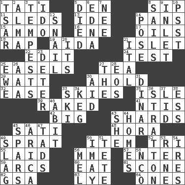 ACROSS 1. Jacques of French films 5. Lair 8. Small drink 11. Bobsleighs 13. Binary compound 14. Zero-star reviews 15. ID or VA city 16. Compass dir. 17. Lubricates 18. Hit sharply and swiftly 19. Opera by Verdi 21. Small island 22. Prepare for publication 24. Trial 25. Artist's stands 27. Beverage made from leaves 29. Electrical Unit 30. Hold, grip (Informal) 32. Comfort 33. Atmospheres 35. Small island 39. Moved through 41. Nuclear Threat Initiatives 42. Of large size 43. Pottery fragments 45. Suttee (variant) 48. Israeli folk dance 49. Small fatty European fish 50. A distinct part 52. Three (prefix) 55. Put down 56. Madame (abbr.) 57. Keyboard key 59. Arches 60. Erode 61. Biscuitlike quick bread 62. Girls' org. (abbr.) 63. Sodium hydroxide 64. Washington bills DOWN 1. Russian ruler of old 2. _ mater 3. Storms 4. Wedding promise 5. Passed on 6. Pulitzer Prize-winning author Ferber 7. Born 8. Moves on water 9. An arm off of a larger body of water 10. Inconspicuous attention getter 12. Slow-paced one 14. Airs 20. ___ a Wonderful Life 21. Slanted text style (abbr.) 23. Prevent from occurring 25. She-sheep 26. Auto club (abbr.) 27. Definite Article 28. Greek goddess of the dawn 30. Help 31. Middle Eastern gold or silver currency 33. What Jean-Claude Killy likes to do 34. Barrel 36. Ski resort town in Vermont 37. Hat (slang) 38. Double-curved letter 40. "This won't hurt ____!" 43. A female animal or person 44. Residences 45. Practice fights 46. N. Chile seaport 47. Small boys 49. Volcanic refuse 50. "If ____ say so..." 51. False hair 53. French philosopher Descartes 54. Angers 56. Cartoonist voice _ Blanc 58. Non-commissioned officer (abbr.)