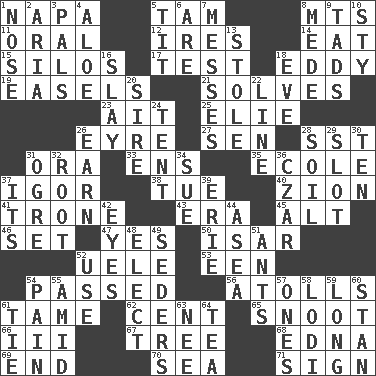 ACROSS 1. California wine valley 5. Scottish cap 8. Mountains (abbr.) 11. Of the mouth 12. Angers 14. Erode 15. Grain storage towers 17. Trial 18. Whirlpool 19. Artist's stands 21. Finds the solution 23. Small island 25. Writer Wiesel 26. Jane of fiction 27. Elected rep. 28. Fast jet (abbr.) 31. Mouth or opening 33. Followers of ems 35. Learning spot: Fr. 37. Russian composer Stravinsky 38. Third day of the wk. 40. The Jewish people; Israel 41. Heavy duty weighing machine 43. Period 45. Keyboard modifier key 46. Put into a specified state 47. It is so 50. Austrian river, tributary to the Danube 52. Ubangi River tributary 53. Car or cant ending 54. Went by 56. Ringlike coral islands and reefs 61. Not wild 62. Penny 65. Snout, nose 66. One more than two 67. Woody plant 68. Pulitzer Prize-winning author Ferber 69. Conclusion 70. Ocean 71. Public display of a written message DOWN 1. Characteristic smell of wine 2. Operatic vocal solo 3. Friends 4. _ vera 5. Teat (slang) 6. "We ___ not amused" (Victoria) 7. Makes clutter 8. Ancient Persian 9. Small boys 10. Filthy place 13. Fur scarf 16. Kill 18. Night before a holiday 20. Father 22. Actor's bit 24. Portable shelter 26. Merit 28. Land 29. Position in a hierarchy or organization 30. Nine, plus one 31. Legendary monster 32. Carrot, for example 34. Institute legal proceedings 36. Russian ruler of old 37. ___ a Wonderful Life 39. 4th largest of the Great Lakes 42. Sight organs 44. Toward the sea 48. Opt 49. Spring feasts 51. Pismires 52. Purpose 54. Ache 55. Among 57. Washington bills 58. Farming town in central California 59. Having great length 60. Comedian Laurel of Laurel & Hardy 61. Make a knot 63. Born 64. Afternoon social gathering