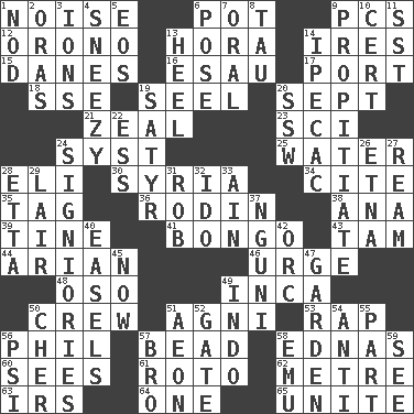 ACROSS 1. Annoying sound 6. Plant holder 9. Personal Computers (abbr.) 12. U. of Maine site 13. Israeli folk dance 14. Angers 15. Natives or inhabitants of Denmark 16. He sold his birthright 17. Left side of a ship or aircraft 18. Compass dir. 19. Stitch closed the eyes of (a falcon) 20. Back-to-school mo. 21. Ardor 23. _-fi 24. System (abbr.) 25. Wetness 28. Biblical high priest 30. Damascus' land 34. Quote 35. Label 36. "The Thinker" sculptor 38. Santa ___, CA 39. Prong on a fork 41. Beat drum 43. Scottish cap 44. Believer in; advocate of (suffix) 46. Goad 48. Bear (Spanish) 49. South American Indian 50. Ship's personnel 51. Hindu god of fire 53. Reproach for some lapse or misdeed 56. Silvers or Donahue 57. Necklace unit 58. Ferber et al. 60. Perceives with the eye 61. Printing process, for short 62. Distance measurement (Brit.) 63. Big collection agency 64. Single 65. Join together DOWN 1. Lower and raise head in agreement 2. Mouths or openings 3. Charged atoms 4. Dwarf with a sinus problem 5. Greek goddess of the dawn 6. Introduce or present, as a question 7. Of the mouth 8. The 19th letter of the Greek alphabet 9. Appease 10. Certainty 11. Fast jet (abbr.) 13. Person who is morally reprehensible 14. Medicinal drug used to evoke vomiting 19. Man with strong sexual desires 20. Compass dir. 22. Double-curved letter 24. Seigniories (variant) 26. Inactive volcano in Sicily 27. 480, 500 or 516 sheets of paper 28. Singer James 29. Den 31. Director Reiner 32. Wedding promise 33. The 18th letter of the Arabic alphabet 37. Group of southern Bantu languages 40. Artist's stands 42. The grampus (Milton) 45. At this time 47. Place where plants grow 49. Southeast Asian peninsula 50. "Mermaids" star 51. Age 52. Yard entry 54. Opposed to 55. Piece 56. 23rd letter of the Greek alphabet 57. Sis' sibling 58. Australian flightless bird 59. Observe