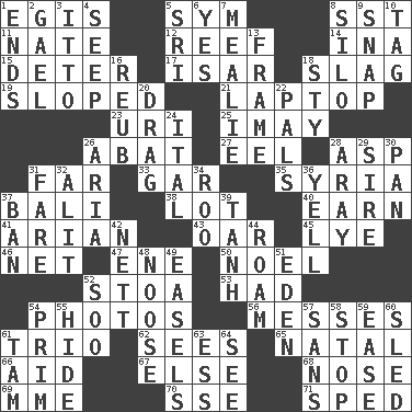 ACROSS 1. The front part of a cuirass 5. Symbol (abbr.) 8. Fast jet (abbr.) 11. Nathan's nickname 12. Coral ridge 14. _ tizzy (2 wds.) 15. Prevent from occurring 17. Austrian river, tributary to the Danube 18. Volcanic refuse 19. Had an oblique or slanted direction 21. Portable computer 23. RI univ. 25. "If ____ say so..." 26. Blind as ____ 27. Snakelike fish 28. Viper 31. Distant 33. Slender fish 35. Damascus' land 37. Indonesian resort city 38. Car dealer's back yard 40. Merit 41. Believer in; advocate of (suffix) 43. Rowing implement 45. Sodium hydroxide 46. Fish or hair follower 47. Compass dir. 50. Christmas carol 52. Portico 53. Possessed 54. Pictures 56. Makes clutter 61. Musical group of three 62. Observes 65. Relating to or accompanying birth 66. Assist 67. Otherwise 68. Characteristic smell of wine 69. Madame (abbr.) 70. Compass dir. 71. Broke a traffic law DOWN 1. Conclusions 2. Highlander 3. "Tell ____ the Marines!" 4. Ooze 5. Indian title of respect (Mr.) 6. Consenting reply 7. Ear of corn 8. Grain storage tower 9. Fastener 10. Label 13. Movie unit 16. Reuben's nickname 18. Filthy place 20. To trail on the ground 22. Friends 24. Slanted text style (abbr.) 26. Roberta Peters solo 28. Like ___ of sunshine 29. Father 30. Baking dish 31. Conductor's collection 32. Set down 34. Friend of Pooh 36. Shout 37. Prohibit 39. Hyperbolic tangent 42. Remaining after all deductions 44. Wander 48. Trap for birds or small mammals 49. Artist's stands 51. Paradise 52. "Barney Miller" actor Jack 54. Demure 55. Flintstone garb 57. Without 58. Close up, plug up 59. Comfort 60. Downhill vehicle 61. Scottish cap 63. Curvy letter 64. Observe